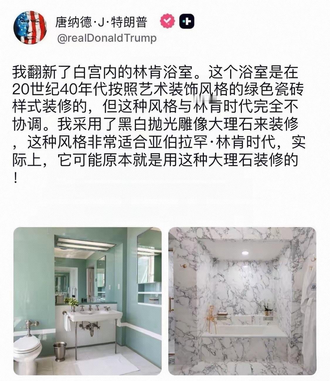 特朗普连换个浴室瓷砖都发帖子,这事儿乍一看还真觉得他有点“没见过世面”。不过细想,这可能也是他刷存在感的一种方式。 特朗普这人在政治上一直挺爱搞大动作,说不定发换瓷砖帖子也是他的一种策略,让民众时刻关注他。这样能保持热度,说不定还能吸引一波流量,让大家继续讨论他呢。