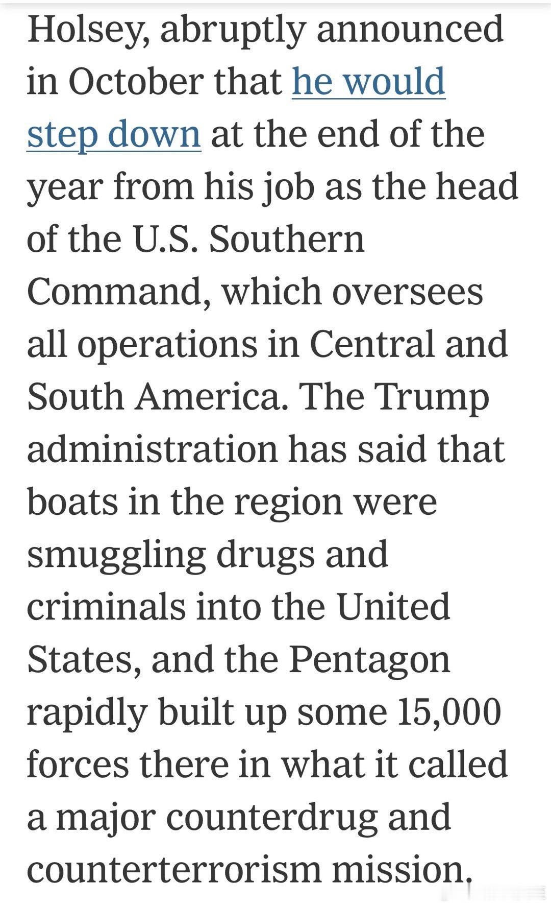 美军南方司令部、原负责中南美的海军上将,今天“退休”他是最初执行总统和国防部长“缉毒、炸船”命令的美军将领,十月宣布辞职,十二月正式退休今年以来,第二十四位辞职/退休的美军少数裔或女性将领