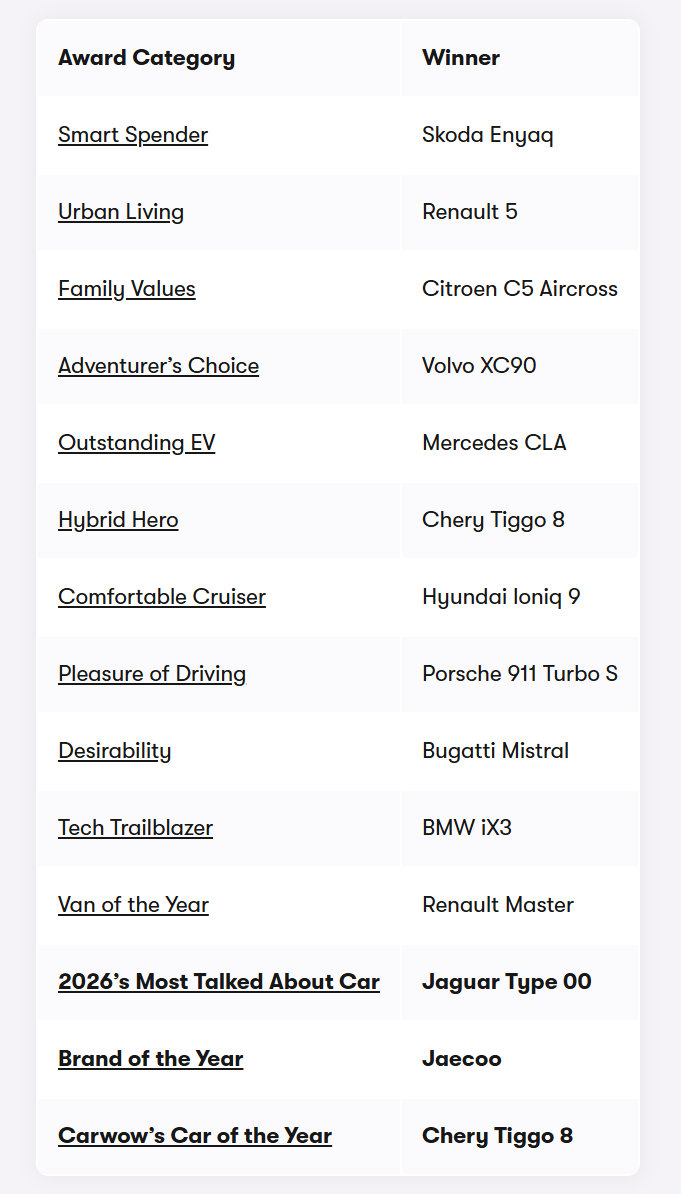 奇瑞瑞虎 Tiggo 8,被英国媒体 Carwow 评为 2026 年度车。Carwow 是英国影响力很大的汽车媒体和购车平台,这个奖是他们的年度总冠军,不是细分奖。另外,年度品牌给的是Jaecoo。也就是说,这一届的两个最高荣誉,基本都被中国品牌拿走了。他们给瑞虎 8 的理由其实很实在:空间、混动成熟度、配置,还有在英国市场里很有杀伤力的定价。几年前还在讨论“中国车能不能在英国站住脚”,现在已经开始讨论“哪一家中国车更值得买”了。大v聊车电车出海奇瑞瑞虎获英国年度车