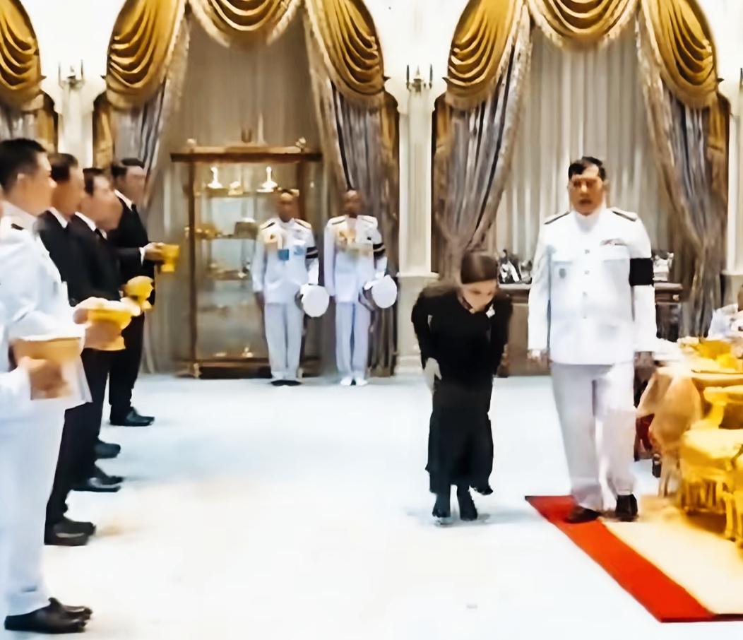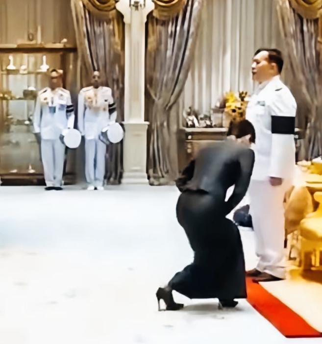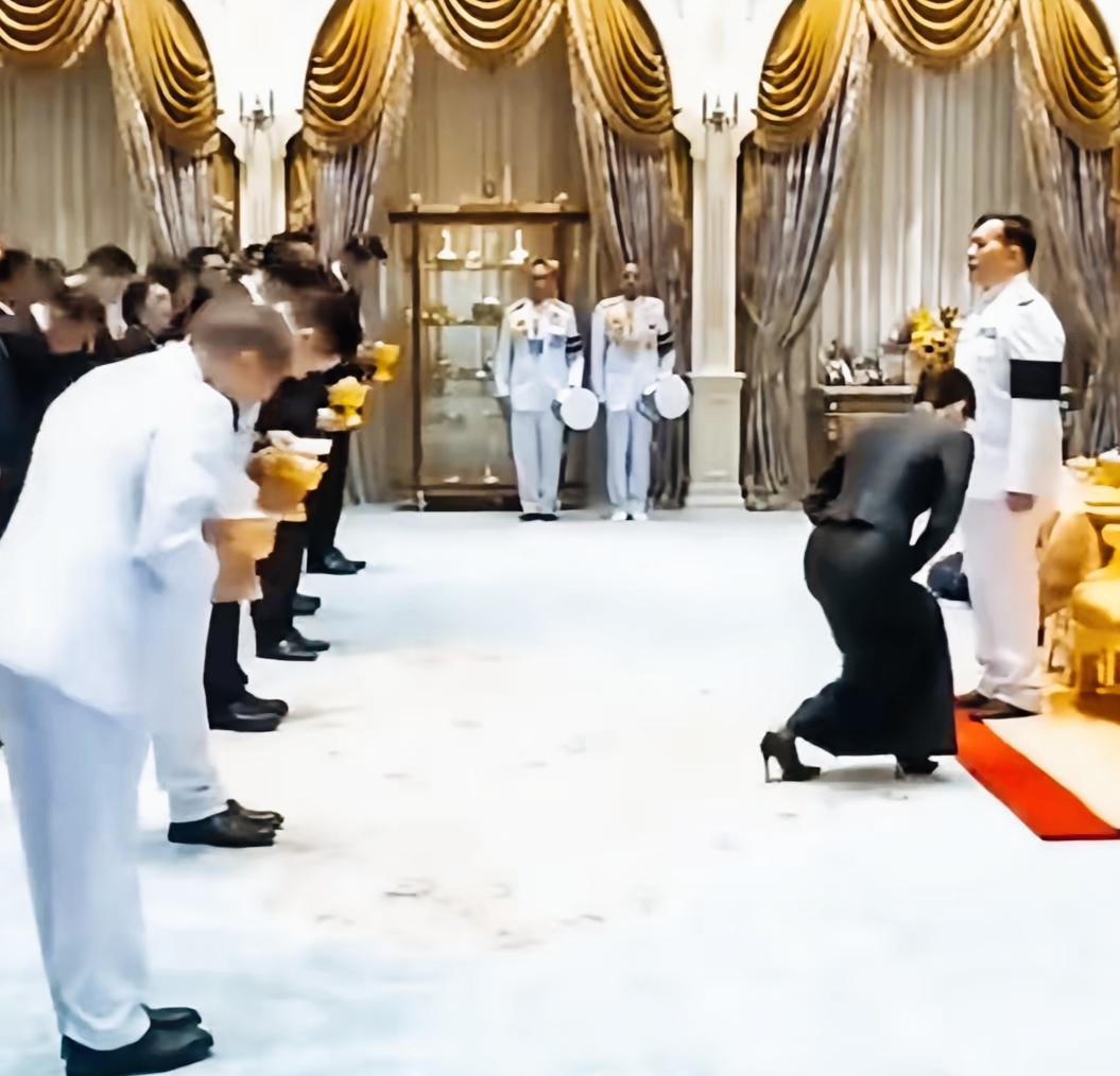 一个姿势就看出了,泰国国王的地位! 穿着高跟鞋做这样的动作,应该也不简单吧? 弯着腰走路是什么意思呢? 是表达敬意和尊重吗? 这样的礼仪方式是不是独具特色啊?