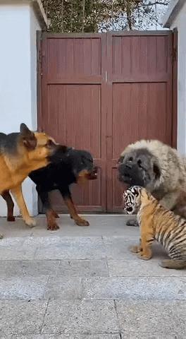 几只狗围着小老虎又推又吼,小崽子缩成毛团不敢动,镜头外有人笑出声。 下一秒母虎从