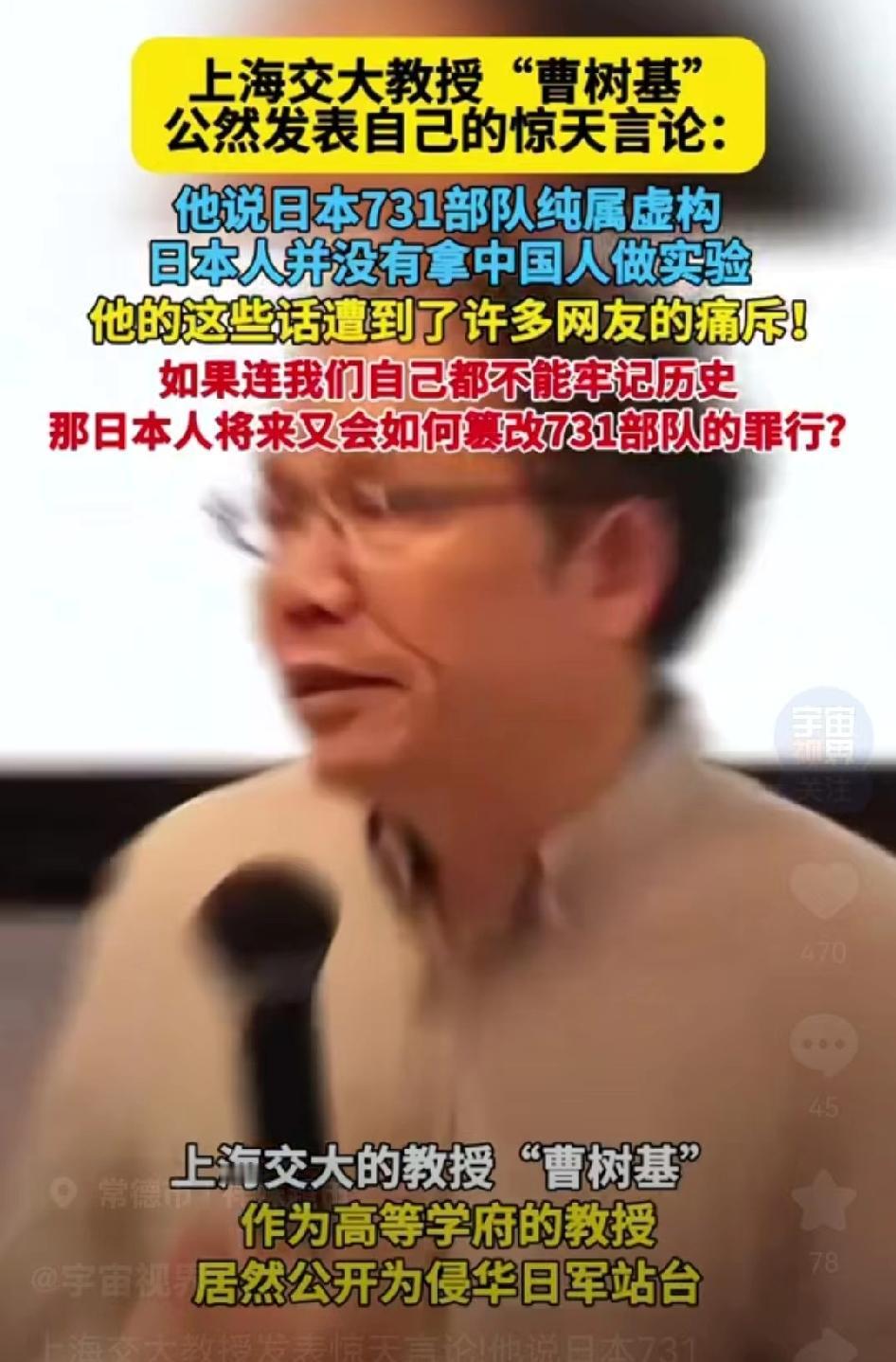 上海交大历史系二级教授曹树基,曾经发表公开言论说,经过他的研究,日本人在二战中,并没有拿中国人做实验,而臭名昭著的731部队,实际上是虚假的谣言, 2020年疫情期间,曹树基在接受记者采访时说,日本人在二战中,从未发动细菌战,所谓二战中日军散播鼠疫等病毒的说法,是出于爱国心和传闻,并没有证据, 这个言论引发舆论大哗,后来经网友深扒,曹教授还是个惯犯,他之前就曾经多次在公开场合说过:731部队并不存在,日军从未拿中国人做实验, 日军在中国发动细菌战,以及731部队的恶行,早已大白于天下,不明白曹树基为什么非要通过造谣的方式,为军国主义行为洗白, 事情发生后,上海交大解聘了曹教授,但是时间不长,他又被香港大学作为人才引进,现在是港大人文研究所教授、博士生导师, 曹教授从未因为自己的言论道过歉,只能说,社会对这样的劣迹教授,还是太宽容了。
