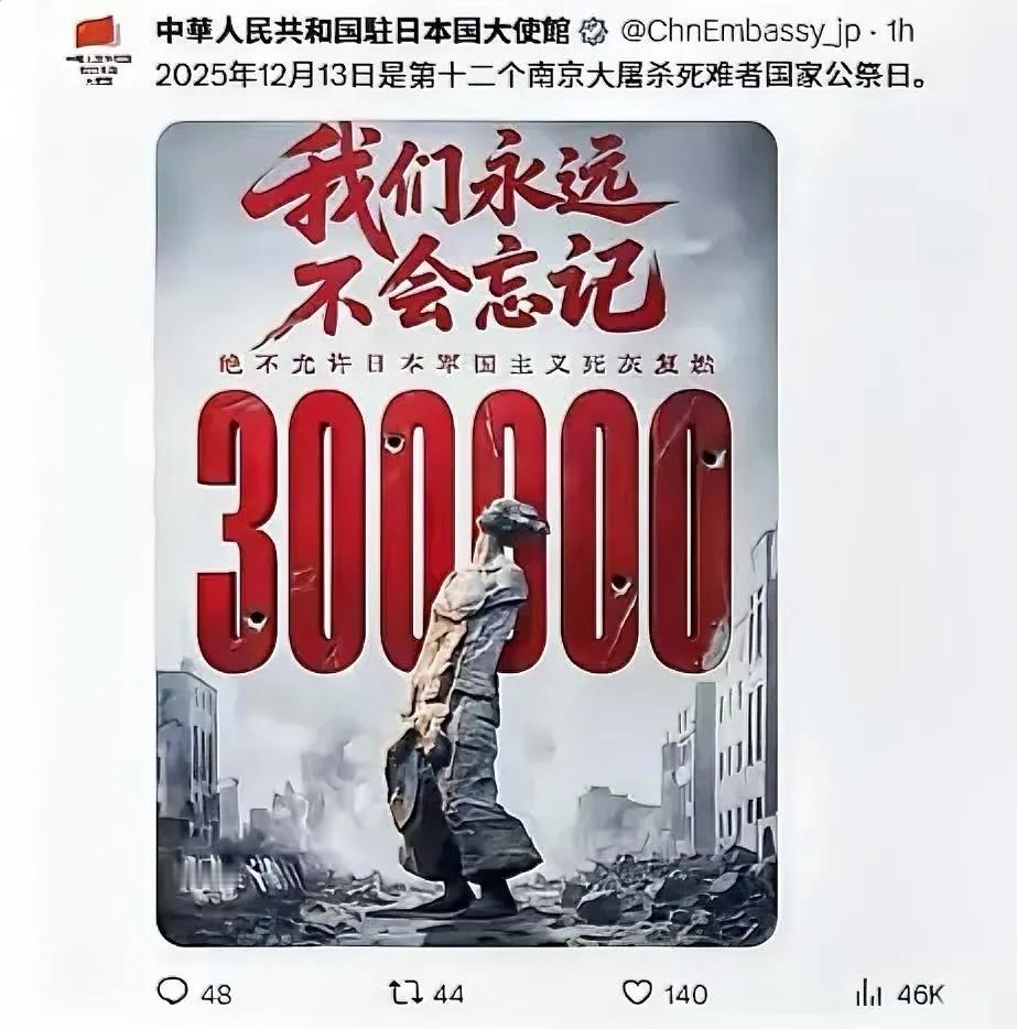 中国驻日大使馆今天(12月13日)发文写道:2025年12月13日是第十二个南京大屠杀死难者国家公祭日,并附图,图中,巨大的红色 “300000” 字样让人醒目,一位衣衫褴褛、身形佝偻的受难者形象立在下面,当时的绝望和苦难是我们现代人无法想象的。 这个刺眼的红色数字,从来不是冰冷的统计符号。每一个“0”的背后,都是一具无辜的躯体,每一笔“3”的重量,都压着88年前南京城的漫天哀嚎。那是长达六周的人间炼狱,是三分之一城市建筑被焚毁的满目疮痍。 今天上午10点,南京的防空警报准时响彻全城。汽车停驶鸣笛,行人就地驻足默哀,这一刻的寂静,是对30万冤魂最沉重的告慰。侵华日军南京大屠杀遇难同胞纪念馆里,8000名各界代表胸前别着白花,肃立在半旗下。 16名礼兵抬着8个花圈缓缓走向公祭台,《国家公祭献曲》的旋律里藏着无尽哀思。石泰峰在仪式上的讲话掷地有声,我们缅怀逝者,更要守住和平的底线。88名青少年宣读《和平宣言》,稚嫩的声音里是不灭的记忆。 三声和平大钟敲响,3000只和平鸽展翅高飞。它们飞过的天空,早已不是当年硝烟弥漫的模样,但我们永远记得,这片土地曾浸满鲜血。远东国际军事法庭早已认定,日军的暴行是人类文明史上的耻辱。 战后审判铁证如山,谷寿夫等战犯得到应有的惩罚,可有些势力从未真正反省。日本右翼不断修改教科书,政要执意参拜靖国神社,甚至质疑正视历史的“村山谈话”,这些行径刺痛着每一个受害者的心。 就在公祭日前夕,中方早已亮明态度,连用三个“绝不允许”敦促日方与军国主义彻底切割。今年是抗战胜利80周年,我们铭记历史,从来不是为了延续仇恨,而是为了不让悲剧重演。 截至今年5月,登记在册的南京大屠杀幸存者只剩26位。他们的记忆正在慢慢消逝,可那段历史永远不能褪色。国家公祭日的设立,就是用立法的力量,把民族的伤痛刻进骨子里。 我们不写日语,不是刻意排斥,而是这份苦难无需用侵略者的文字注解。30万生命的重量,足以震撼世界,足以让每一个中国人明白,强大才是守护和平的底气。 今天的中国早已山河无恙,中国式现代化的画卷正在展开。但警报声时刻提醒我们,忘记历史就意味着背叛。每一次祭奠,都是一次精神的洗礼,都是一次力量的凝聚。 铭记不是停留在过去,而是要面向未来。我们传承的不仅是伤痛的记忆,更是伟大的抗战精神。唯有踔厉奋发,才能告慰先烈,才能让和平的阳光永远照耀这片土地。 各位读者你们怎么看?欢迎在评论区讨论。