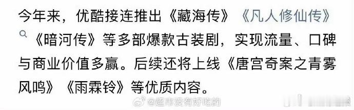 优酷认证的今年三部古装爆款剧藏海传凡人修仙传暗河传三部爆款剧 优酷凭三部剧领跑古装赛道,《藏海传》权谋紧凑,《凡人修仙传》成长戳心,《暗河传》情感细腻。