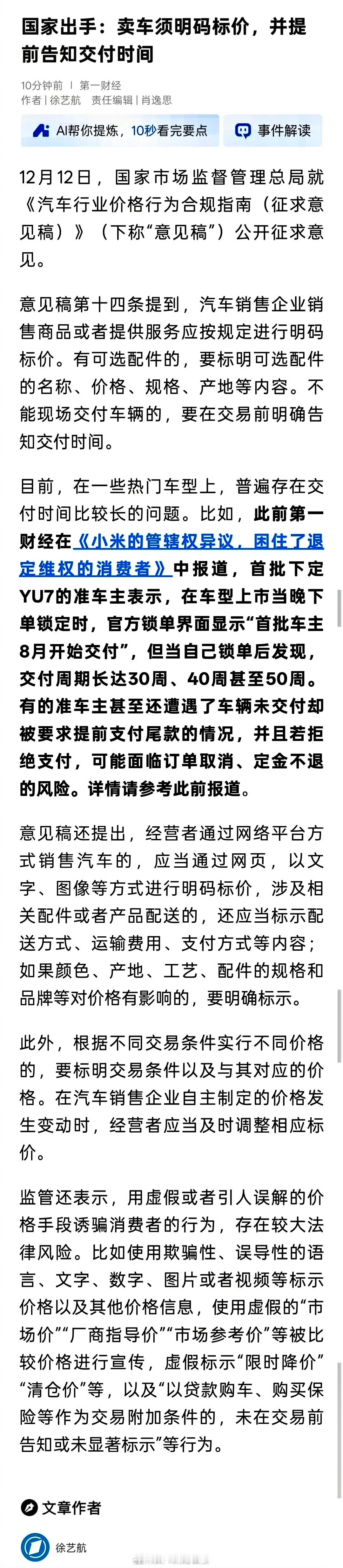 车还没影儿呢,交车周期约长达30周了,车没有见影结果却催你先把尾款付清?但好消息是国家真的出手了,是直接把“交付时间必须提前明确告知,并写入合同”写进了《汽车行业价格行为合规指南(征求意见稿)》里。而且你看,比亚迪、小鹏这些大厂已经第一时间表态支持新规,说明行业也在往透明、诚信的方向走。