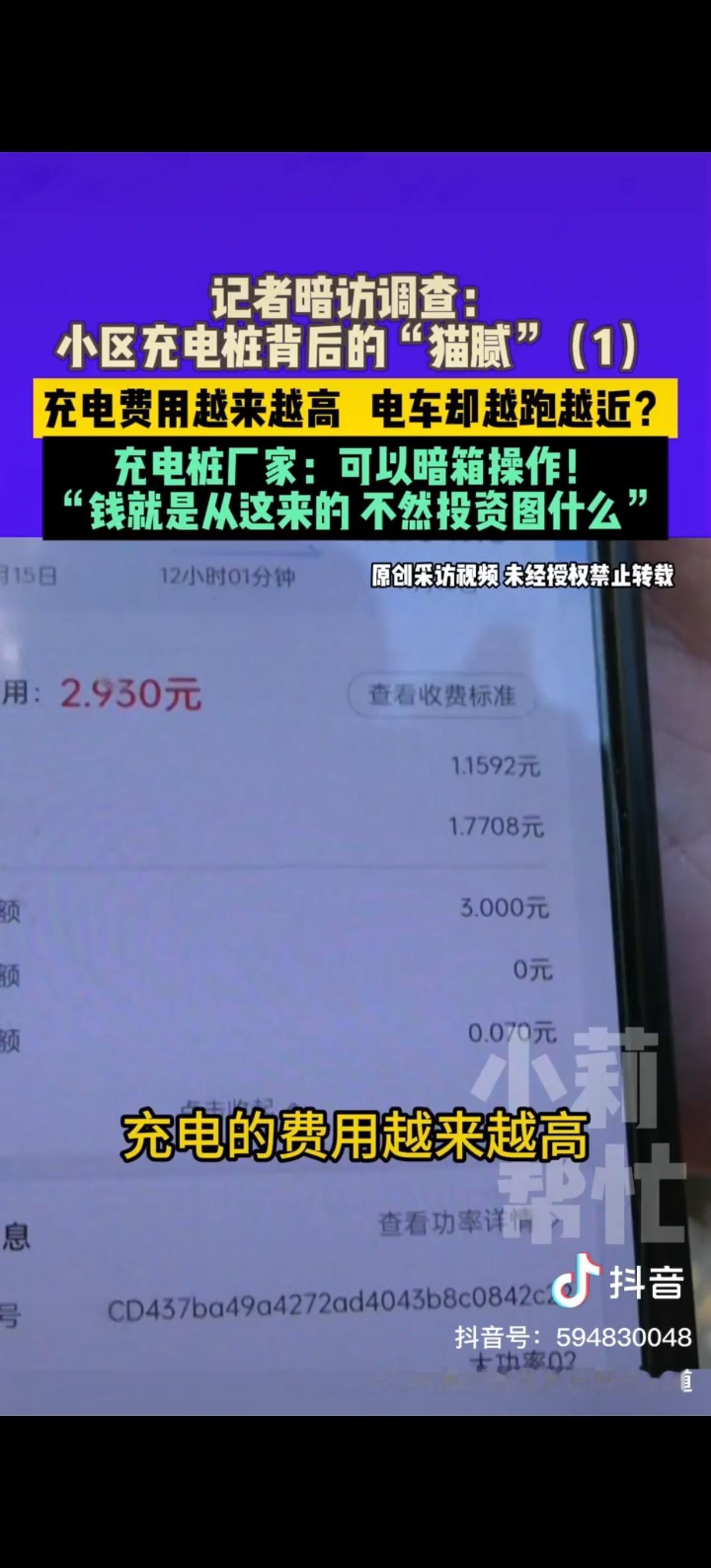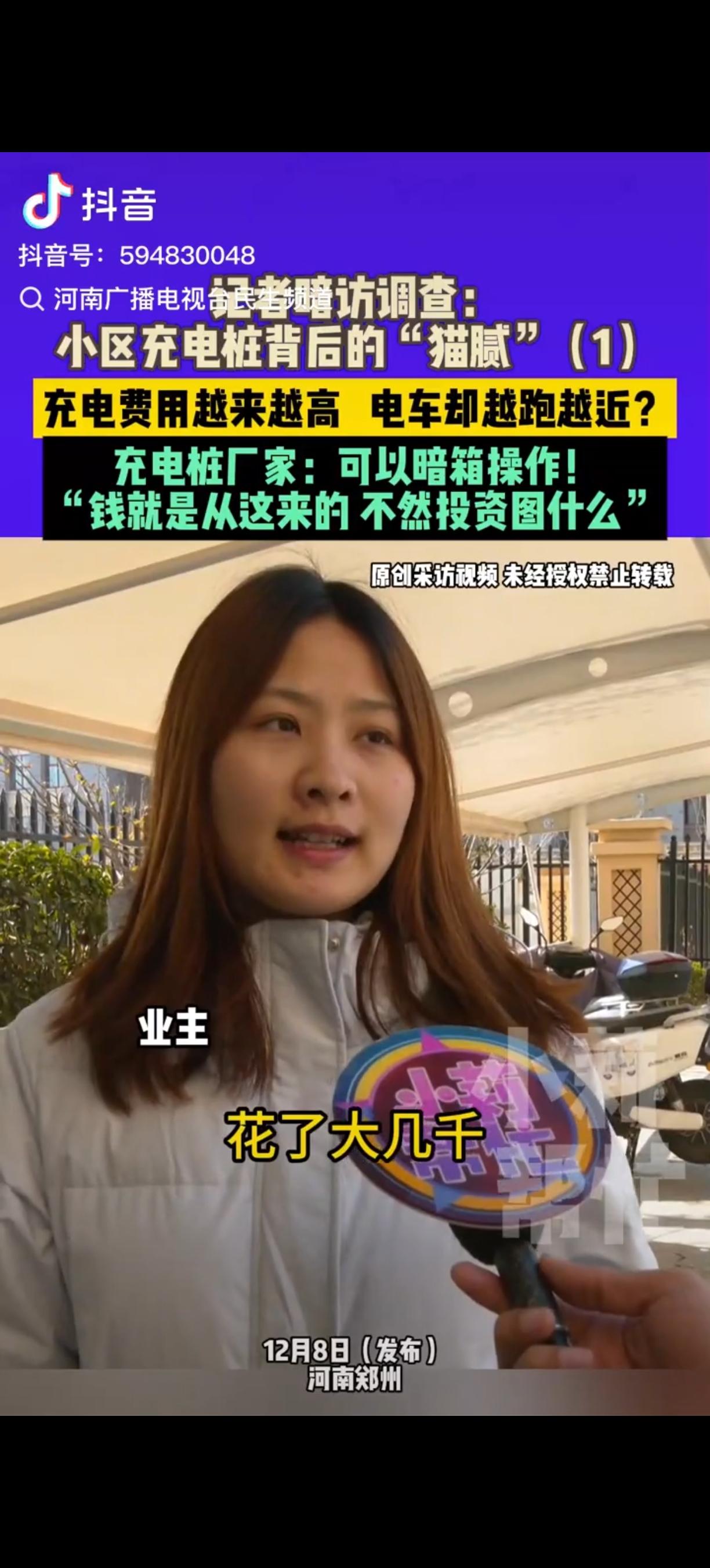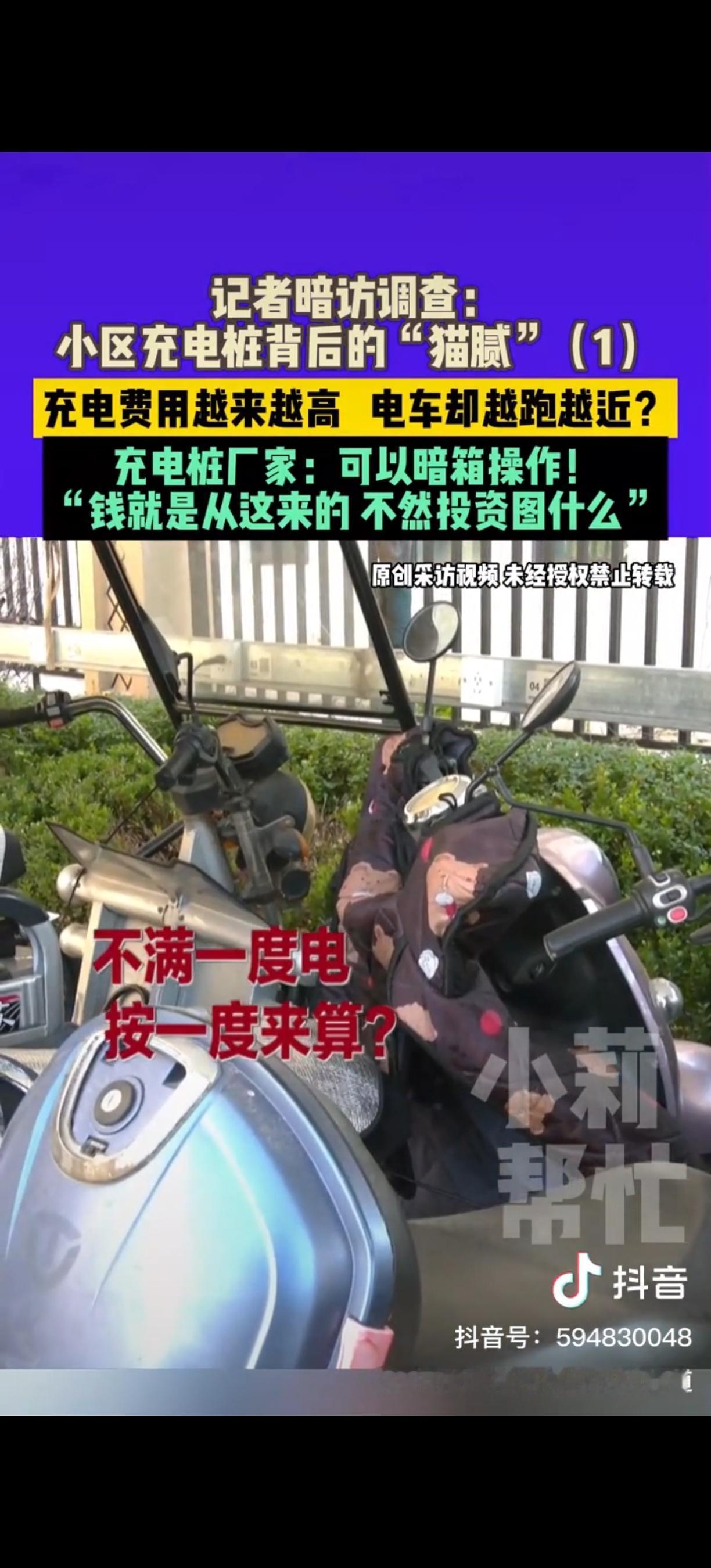 电瓶车充电桩的“猫腻”终于被曝光了!河南,女子花大几千买了个新电动车,商家承诺能跑80km,可是她充满电只能跑40多公里,她怀疑过电池,电动车质量,甚至怀疑天冷了电池耗电高了,从没怀疑过小区的充电桩,结果调查结果让她震惊不已! 起初,女子怎么也想不通,新车电池不该这么“不禁用”。直到和邻居一聊,才发现大家都有类似遭遇。有人吐槽,在老家充两块钱电,电动车能跑四五十公里,可在小区里,花三四块钱充的电,跑二十来公里就没电了,钱没少花,电却像“虚胖”一样不经用。 为了查清真相,记者展开调查,发现这种情况并非河南独有,全国多地都有业主反映同款问题——充电桩显示充满电,电动车实际续航却大打折扣。 记者随后以安装充电桩为由,暗中联系了浙江一家充电桩生产厂家。对方的答复让人大吃一惊,他们表示,充电桩可以通过后台悄悄设置,比如降低充电功率、调整充电系数。举个例子,明明没充到一度电,却按照一度电来收费。更离谱的是,这些操作在手机小程序里就能完成,业主充电时根本察觉不到。 厂家甚至直言不讳,这么做就是为了赚钱,不然谁会投钱装充电桩,总不能是做公益吧。 目前,记者已将这些问题反映给辖区相关部门,工作人员正在开展调查,此事后续如何,还需持续关注。 各位读者你们怎么看?欢迎在评论区讨论。 来源:河南广播电视台民生频道 2025-12-8发布