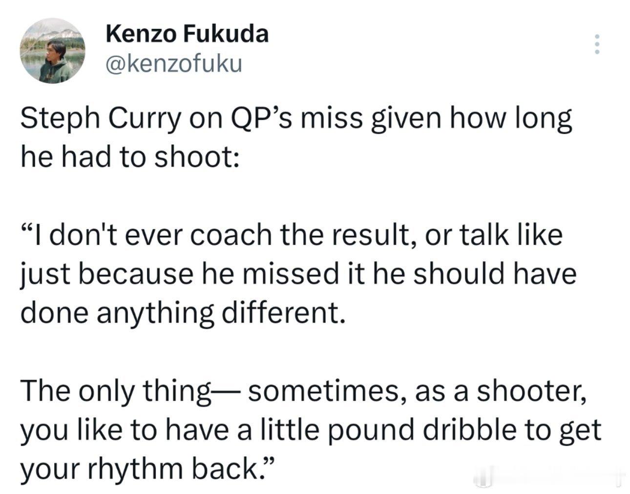 库里给波斯特最后的卡机三分表示建议:“我从不以结果为导向进行指导,也不会说他投丢了下次就应该采取不同的做法。唯一需要注意的是——作为射手,有时候喜欢重新运一下球,可以找回投篮节奏。”