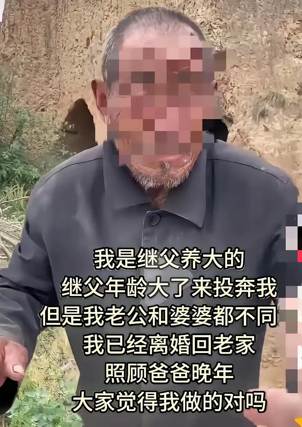 山东,一女子跟着继父长大,后来出嫁,继父失去劳动能力,便步行到女子家,想和女子一起生活,女子丈夫拒绝。为了感谢继父的养育之恩,女子离婚回家照顾继父。 网友评论: 女子做的对,如果继父家里还有兄弟姐妹照顾的话男的这样说可能还说的过,但是老人现在只剩一个人还丧失劳动能力,她不照顾还能给谁照顾 女孩的丈夫太不懂事了,首先女孩懂得感恩养父,说明她是个三观正的人,也会对男孩父母好的,离婚了,男孩会后悔的。支持女孩的做法! 人生就是这几十年的光景,虽然不赞同她的选择,但是她的那顆知恩图报的爱心一定给她点赞!
