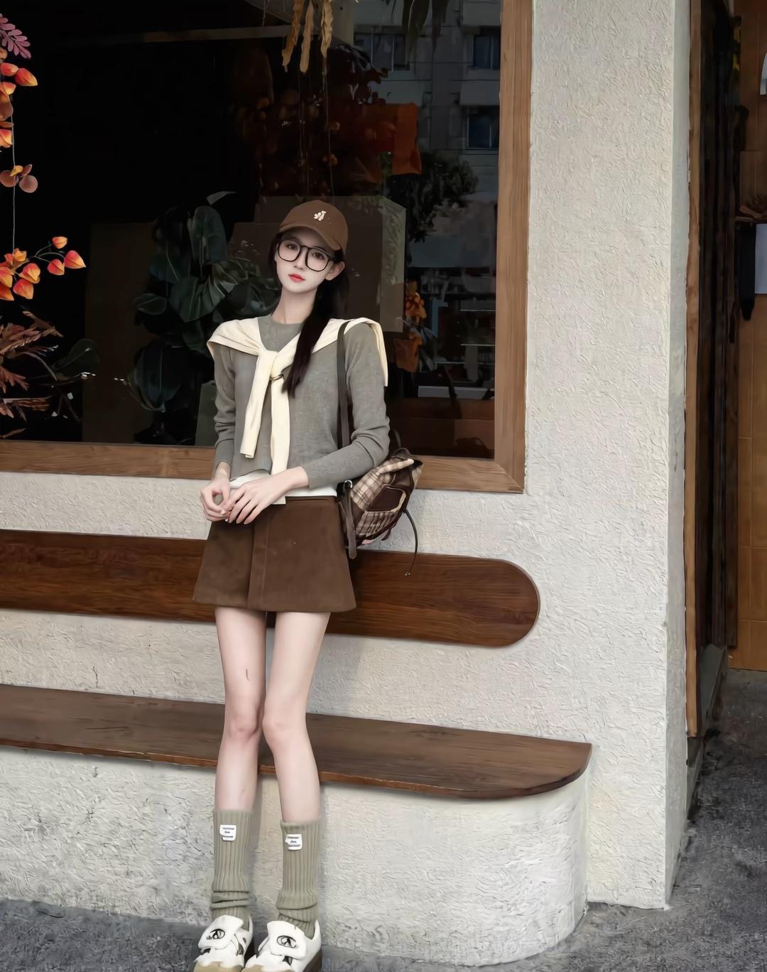 复古学院风穿搭,棕色短裙+灰色毛衣,搭配棕色小包,时尚又减龄!