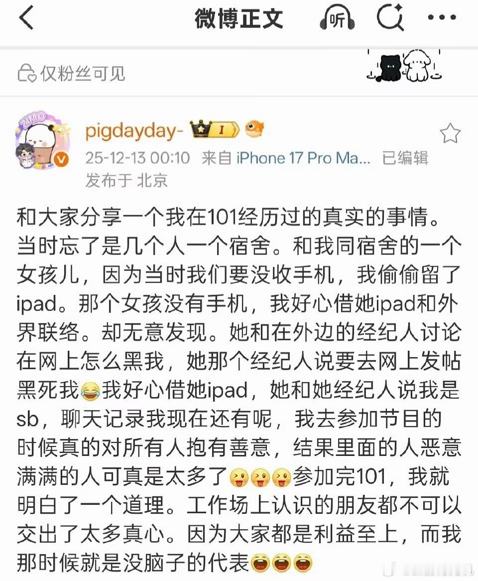快2026了居然还有创造101的瓜!朱天天又曝瓜,说创造101时候自己借iPad给一个同宿舍女生用,结果发现女生和其经纪人在骂自己。