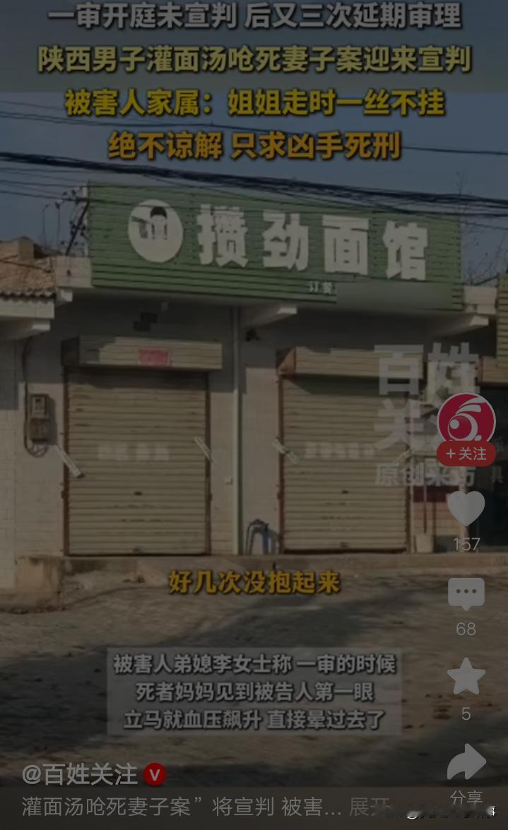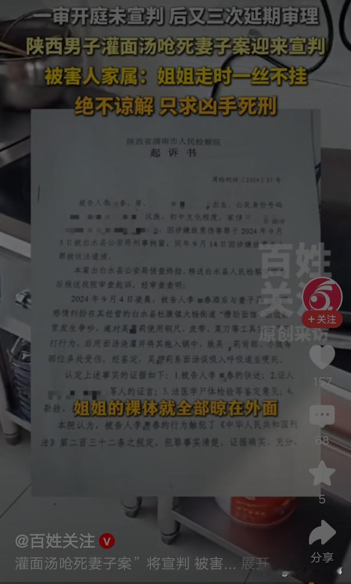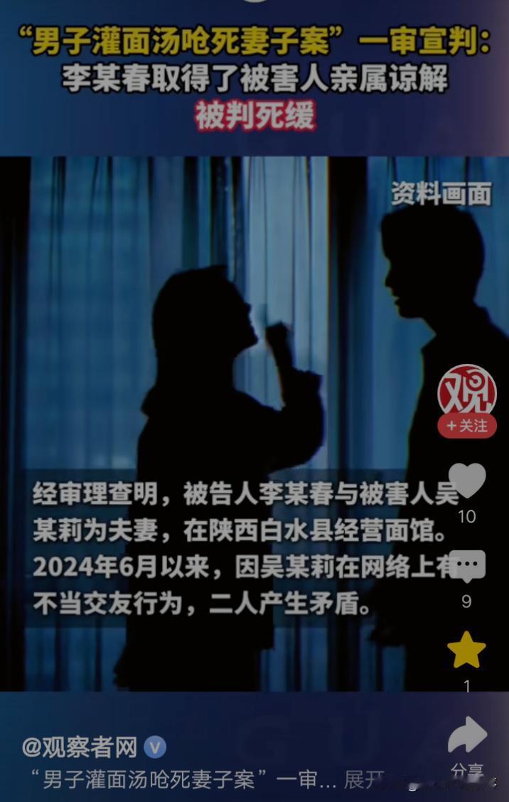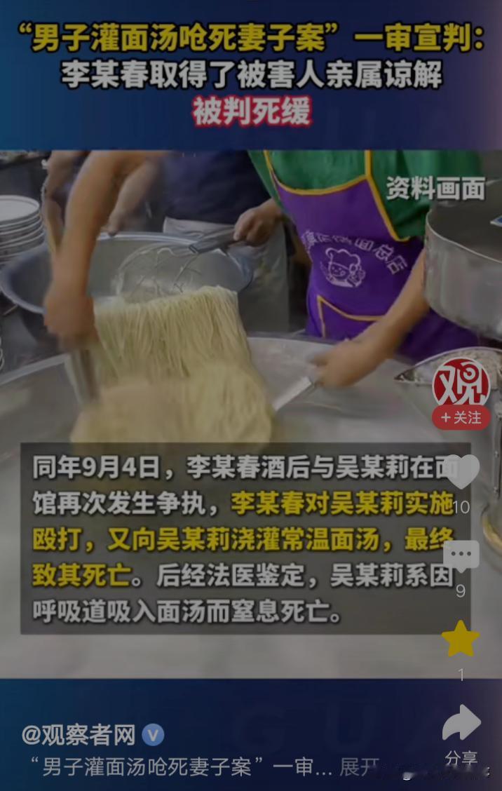 39岁女子吴某莉,曾不顾父母,嫁给李某春,却被李某春家暴二十多年。因感情纠纷,吴某莉被李某春灌70度面汤,把她拖进锅里,致吴某莉被面汤呛死。 陕西渭南省白水县,19岁女子吴某莉,老实而温柔,不多言多语,但是她眼睛满是善良与真诚,给人一种文静,温暖的感觉。 那年,吴某莉和李某春一见钟情,自然而然成为恋人。 可是李某春家境贫寒,没有房子住,居无定所,也没有一技之长,可以让吴某莉衣食无忧。 吴某莉的父母担心,女儿嫁给李某春,不会幸福,坚决反对吴某莉和李某春的婚姻。 那时候,吴某莉对李某春情深如许。她固执己见,不顾父母反对,毅然决定和李某春结婚。 婚后,李某春没有房子,一家人不停地租房,搬家。这种日子就像一地鸡毛,为不知何时,才能改变现状而忧心忡忡。 多年后,吴某莉的大女儿,小儿子上学了,她跟着李某春外出打工。 十几年,吴某莉和李某春经历打工的苦与辛酸,省吃俭用,终于挣到人生第一桶金。 此后,吴某莉和李某春,带着多年的积蓄,回到阔别多年的老家,修建新房。 为了维持生计,李某春和吴某莉,在镇上租门面,开了一家攒劲面馆。 从此,吴某莉和李某春共同经营面馆。经历从无人问律,到面馆门庭若市的过程。 生意好,收入多了,但是吴某莉的日子,却没有家庭经济改变而变好。 十几年前,吴某莉被李某春家暴,如今,她依然被李某春家暴,每天度日如年,却因无法改变的命运而苦恼。 2024年6月,李某春发现妻子吴某莉,在网上有不当交友行为,两人为此事,发生了矛盾,夫妻感情变淡。 此时,吴某莉终于鼓起勇气,想和李某春离婚,但是她的母亲思想传统,极力劝阻吴某莉。 吴某莉老实,她想离婚的念头,在母亲,及其亲友的劝说下,她犹豫了。 2024年9月4日,深夜,李某春和吴某莉,再次为感情纠纷一事,发生吵架。 他用钢尺,皮带,菜刀等工具,殴打吴某莉5个小时。 一会儿,李某春把吴某莉,拖出卧室,来到面馆后厨,他把70度面汤,灌进吴某莉嘴里。 瞬间,李某春把吴某莉拖入锅中,致吴某莉吸入面汤,窒息死亡。 陕西省渭南市中级人民法院认为,被告人李某春因婚姻家庭矛盾,故意非法剥夺他人生命,其行为已构成故意杀人罪。 但是李某春有自首情节,被害人吴某莉对本案发生有一定责任,且李某春取得了被害人亲属谅解,故对其从轻处罚。 2025年12月12日,一审判决,判处李某春死刑,缓两年执行,剥夺政治权利终身。 吴某莉被李某春灌面汤呛死,吴某莉的母亲,痛失爱女的痛苦,无以言喻。 但是她为了外孙女,外孙,做出千难万难的抉择,谅解了李某春。 来源百姓关注,观察者网,红星新闻,