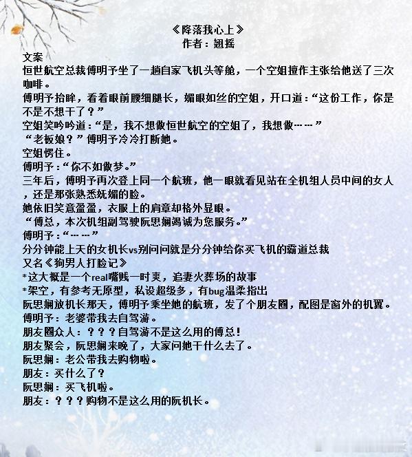 推文 《降落我心上》作者:翘摇文案恒世航空总裁傅明予坐了一趟自家飞机头等舱,一个空姐擅作主张给他送了三次咖啡。傅明予抬眸,看着眼前腰细腿长,媚眼如丝的空姐,开口道:“这份工作,你是不是不想干了?”空姐笑吟吟道:“是,我不想做恒世航空的空姐了,我想做……”“老板娘?”傅明予冷冷打断她。空姐愣住。傅明予:“你不如做梦。”三年后,傅明予再次登上同一个航班,他一眼就看见站在全机组人员中间的女人,还是那张熟悉妩媚的脸。她依旧笑意盈盈,衣服上的肩章却格外显眼。“傅总,本次机组副驾驶阮思娴竭诚为您服务。”傅明予:“……”分分钟能上天的女机长vs别问问就是分分钟给你买飞机的霸道总裁又名《狗男人打脸记》*这大概是一个real嘴贱一时爽,追妻火葬场的故事*架空,有参考无原型,私设超级多,有bug温柔指出阮思娴放机长那天,傅明予乘坐她的航班,发了个朋友圈,配图是窗外的机翼。傅明予:老婆带我去自驾游。朋友圈众人:???自驾游不是这么用的傅总!朋友聚会,阮思娴来晚了,大家问她干什么去了。阮思娴:老公带我去购物啦。朋友:买什么了?阮思娴:买飞机啦。朋友:???购物不是这么用的阮机长。