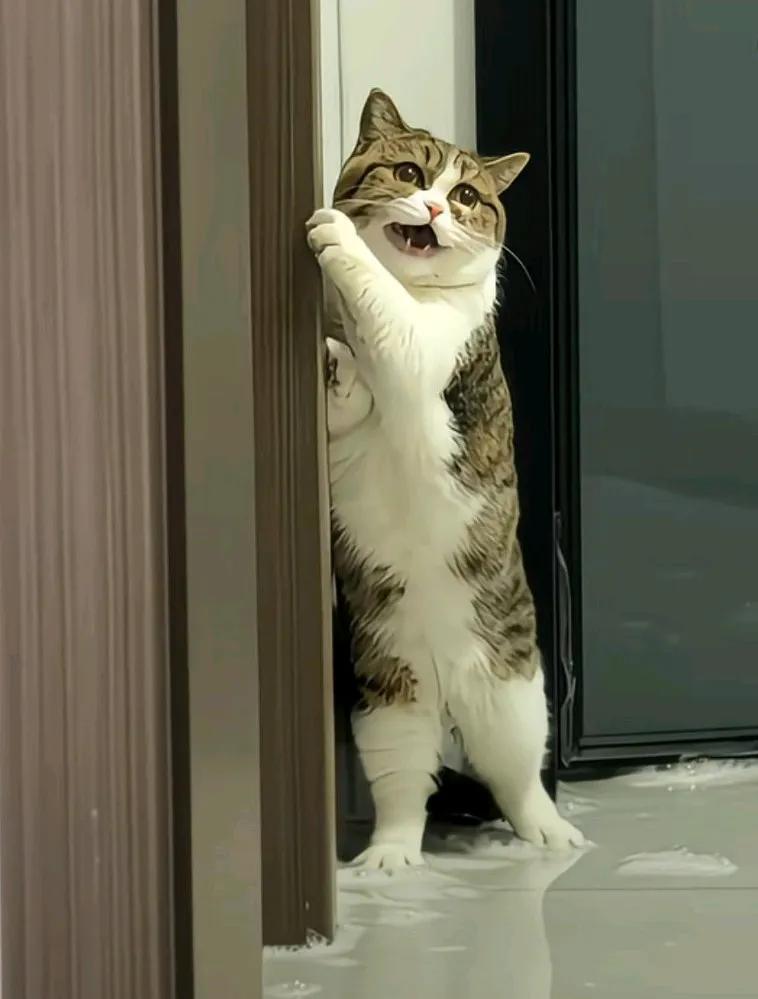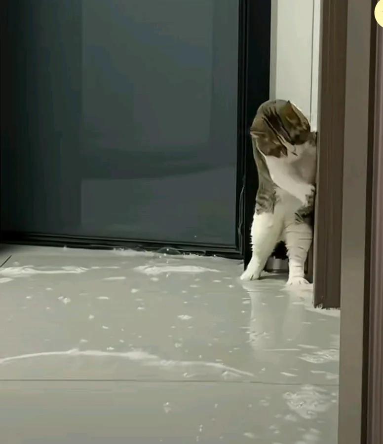 主人扫水小猫蹲在墙角,并且吓得小猫一直喵喵的叫个不停。 猫都直立起来了, 爪子抓着门框在那惊恐的看着地下的水。 小猫,说我这鞋子是真皮的,不能沾水。 网友说,他肯定在骂你, 而且骂的很难听。 猫都吓成这样了, 还不赶紧把它抱起来, 真是坏主人!