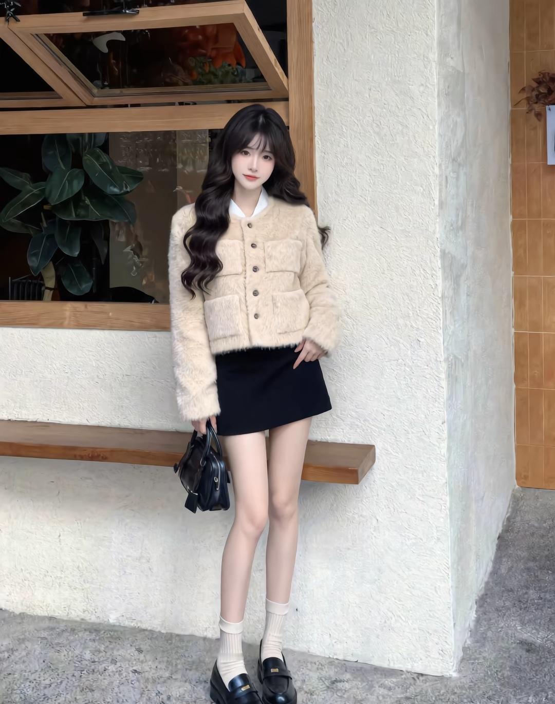 秋日穿搭指南:毛绒外套+黑色短裙,甜美又保暖!
