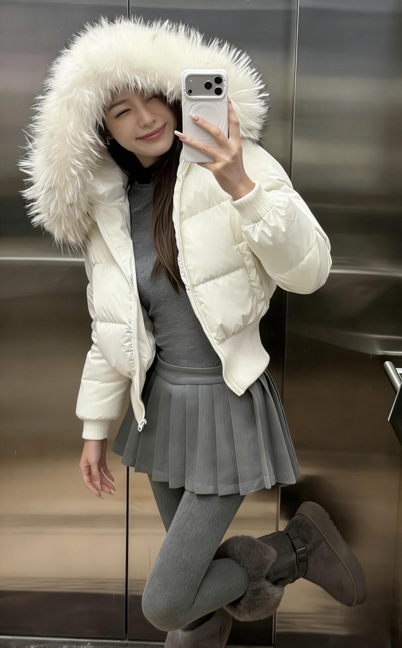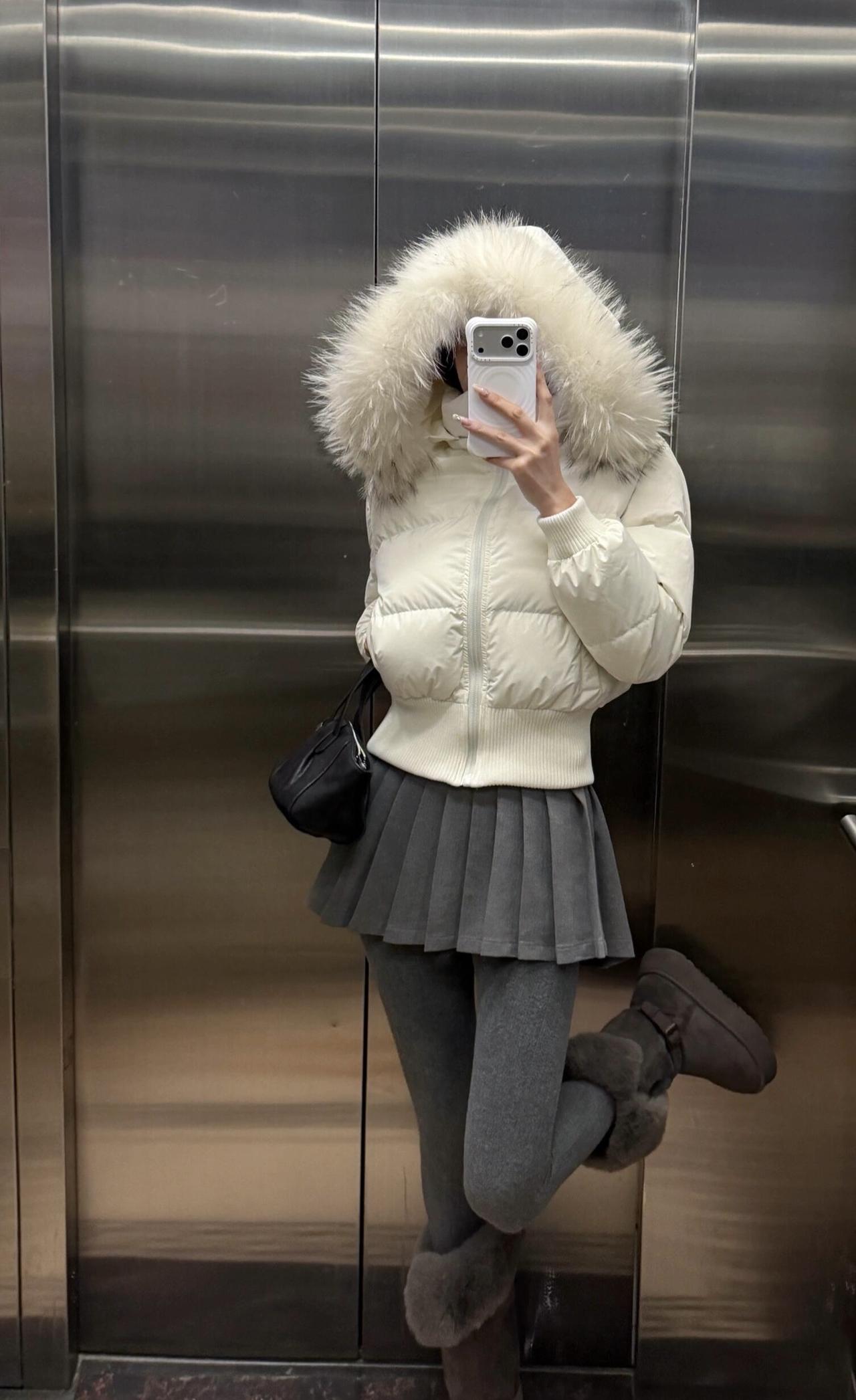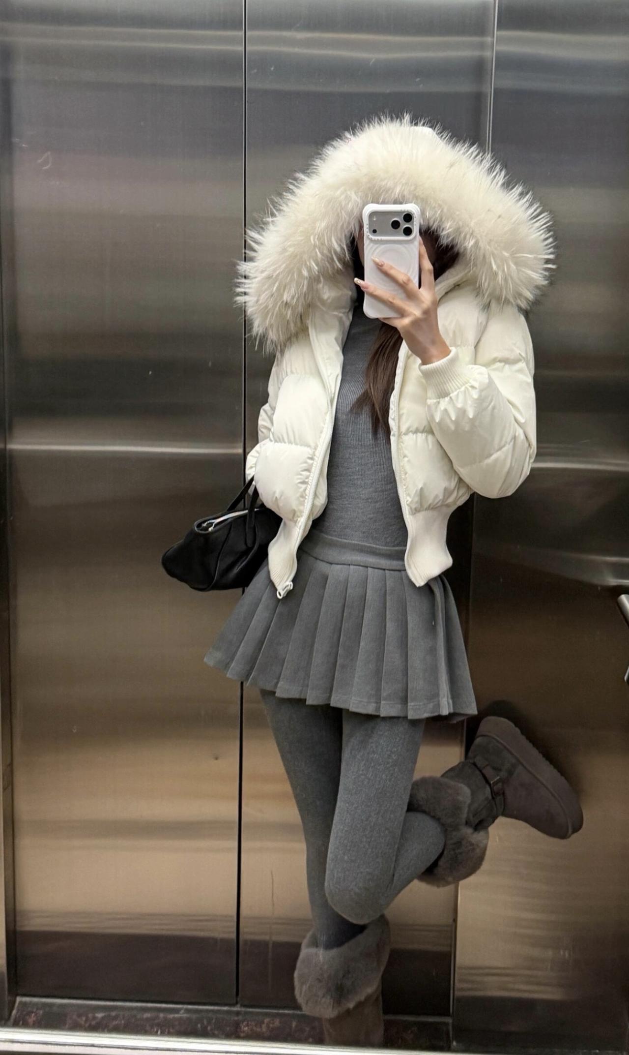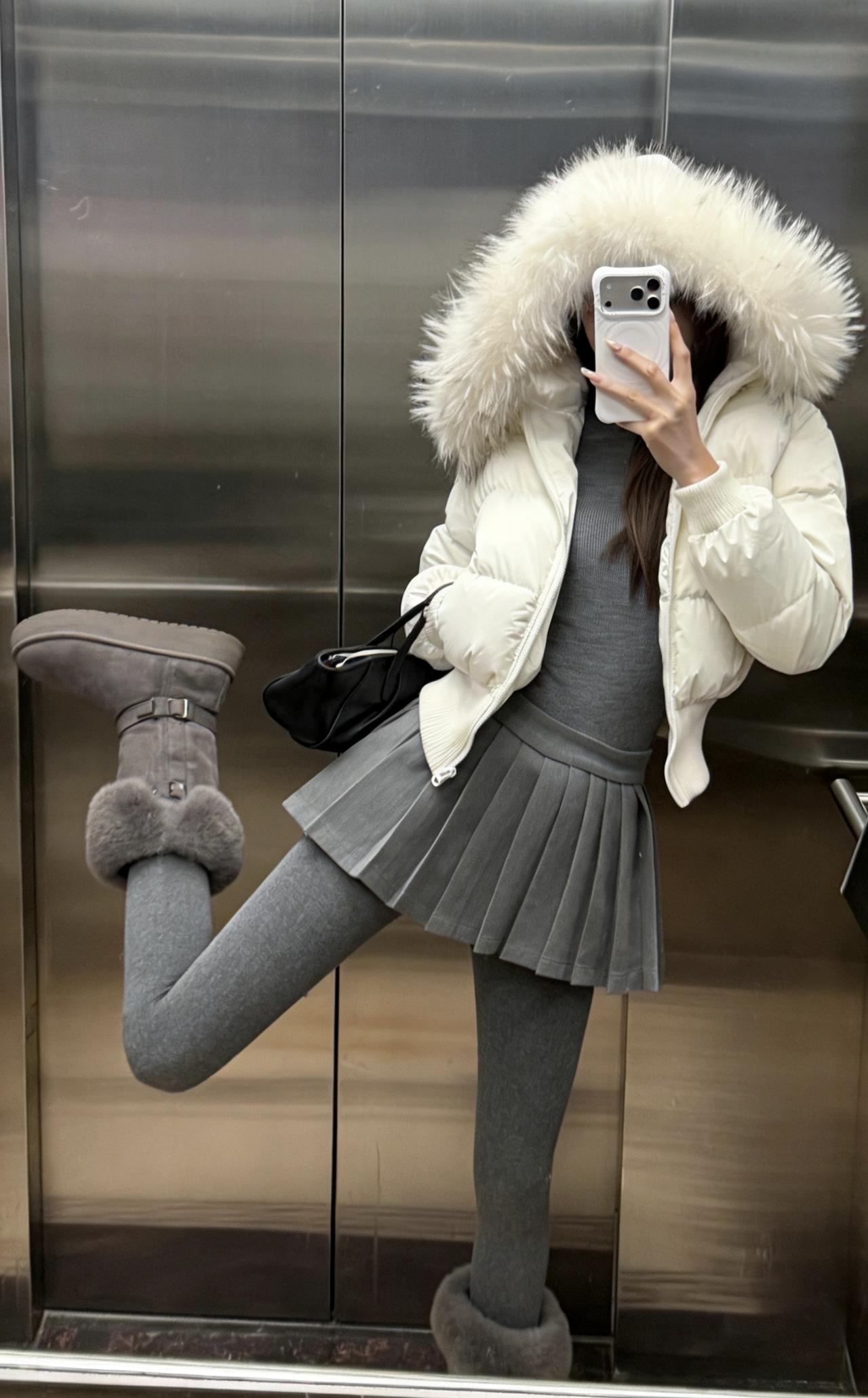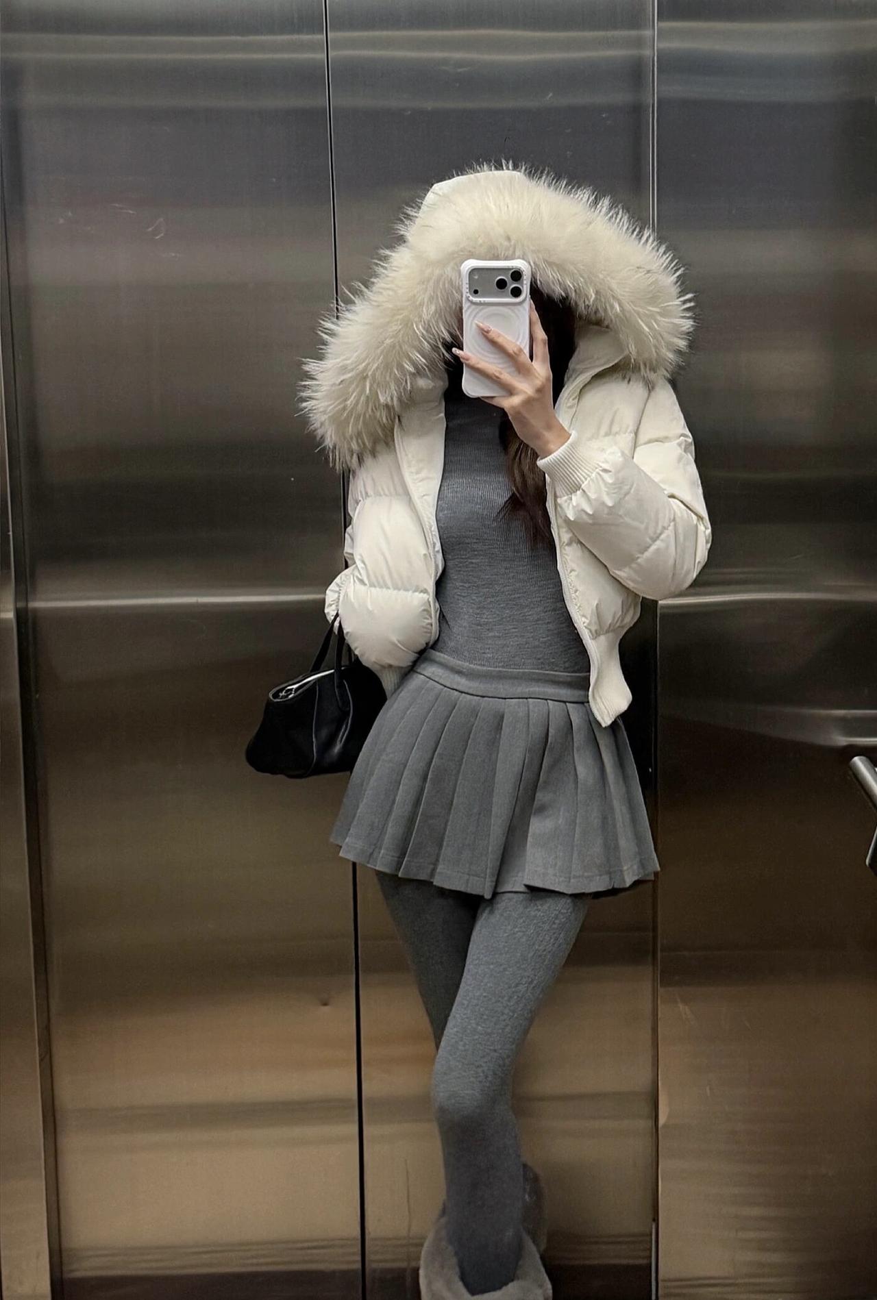 今日穿搭推荐是冬日甜酷休闲风的典型搭配,核心是「温暖外套+修身针织套装+保暖鞋履」的组合: 上装:米白色大毛领短款羽绒服,蓬松的毛领增加氛围感,短款版型拉高腰线;内搭灰色修身针织连体/套装,贴合身形的设计中和了羽绒服的臃肿感,简约又显瘦。 下装:灰色百褶短裙+同色系紧身打底裤,百褶裙增添少女感,打底裤兼顾保暖与修身,避免光腿的寒冷。 鞋履:深灰色雪地靴,毛绒设计与羽绒服毛领呼应,保暖的同时适配整体休闲风格。 适合场合:日常逛街、下午茶、通勤,轻社交场合、短途出游等等。