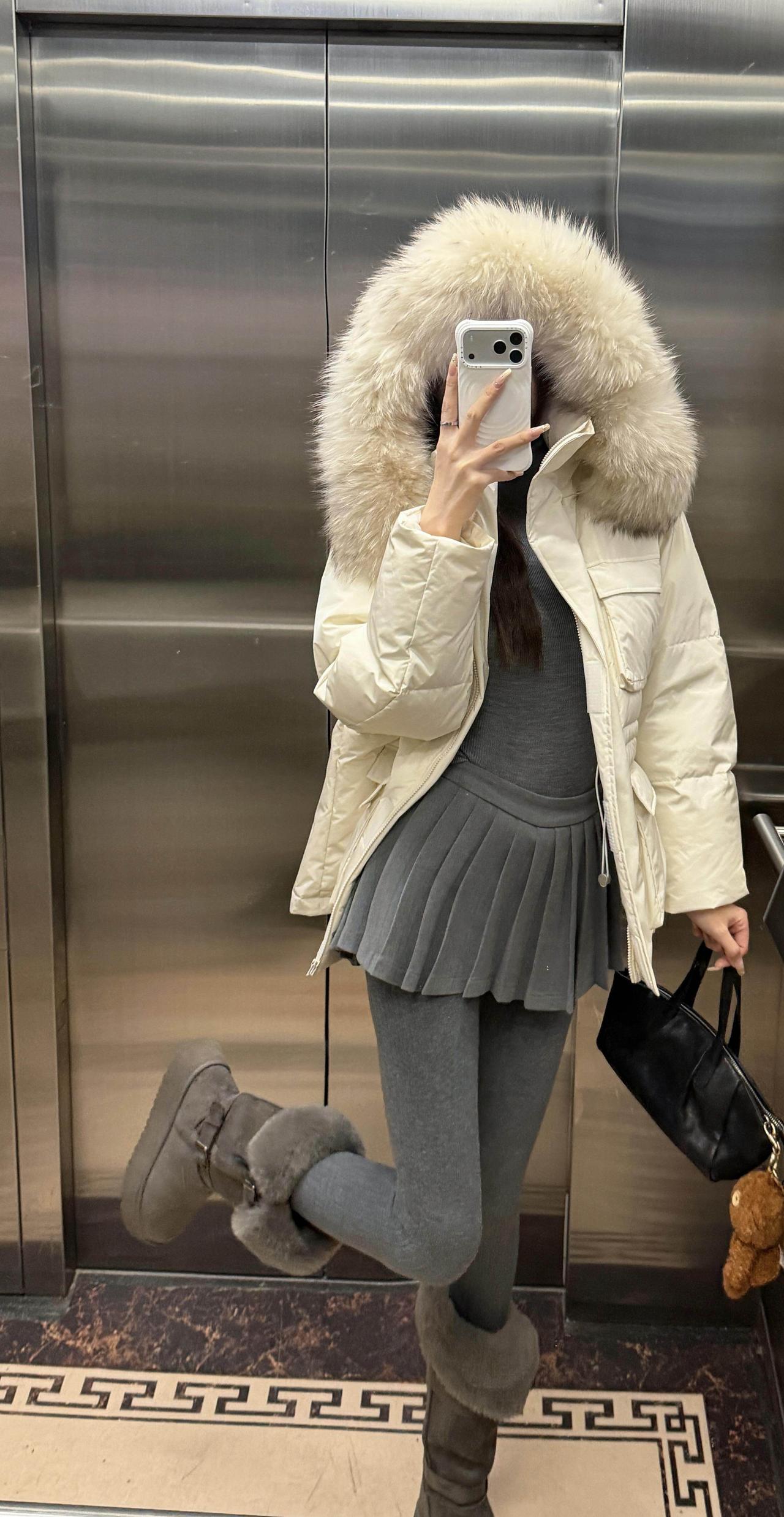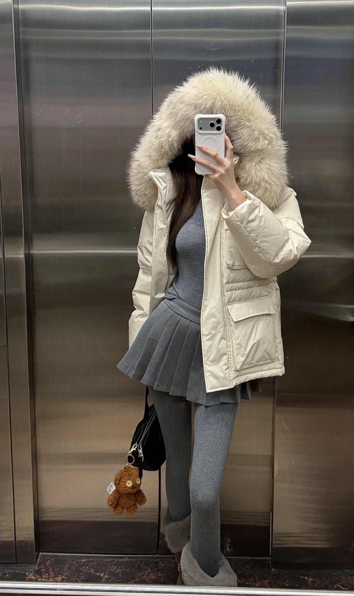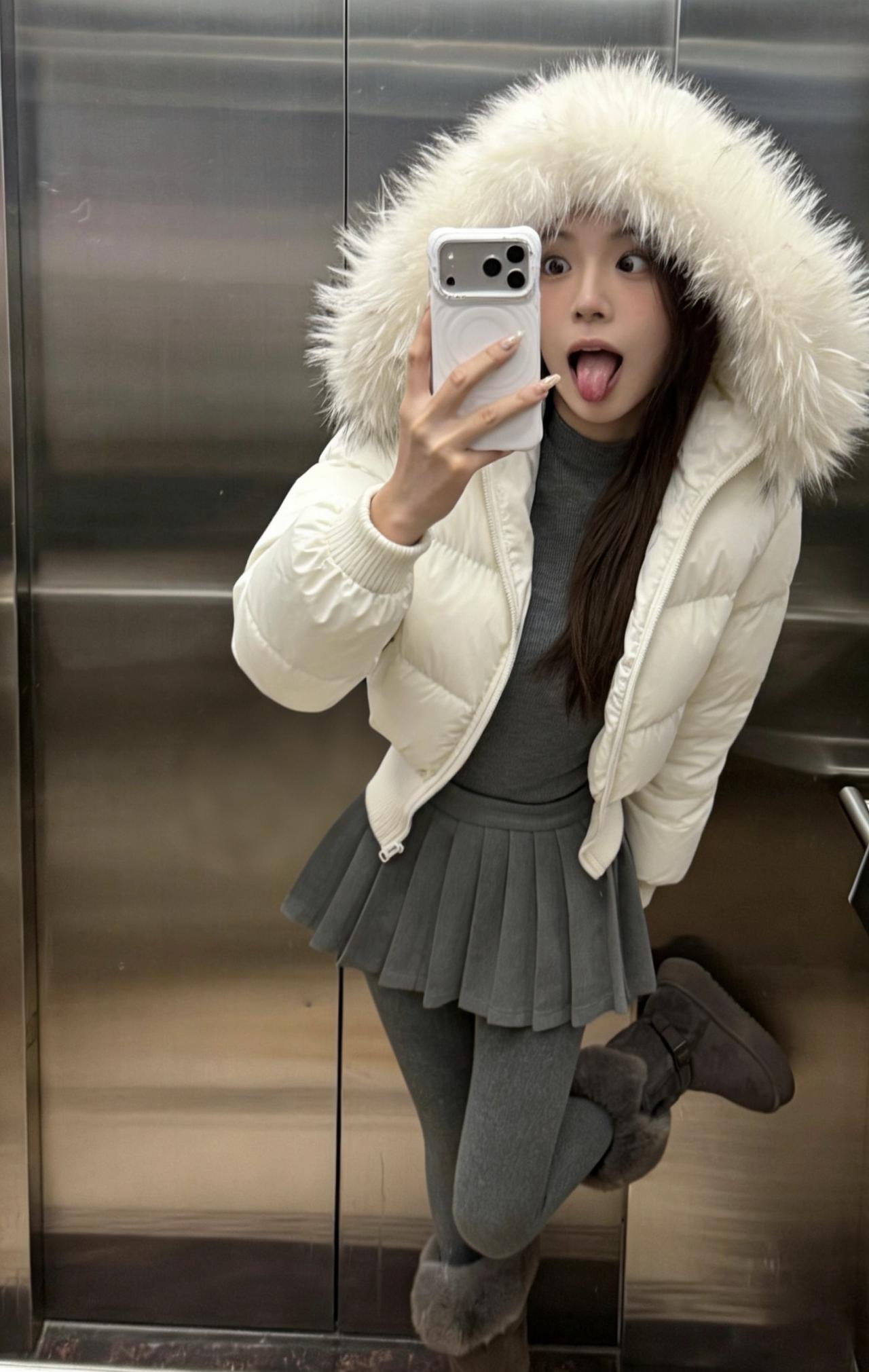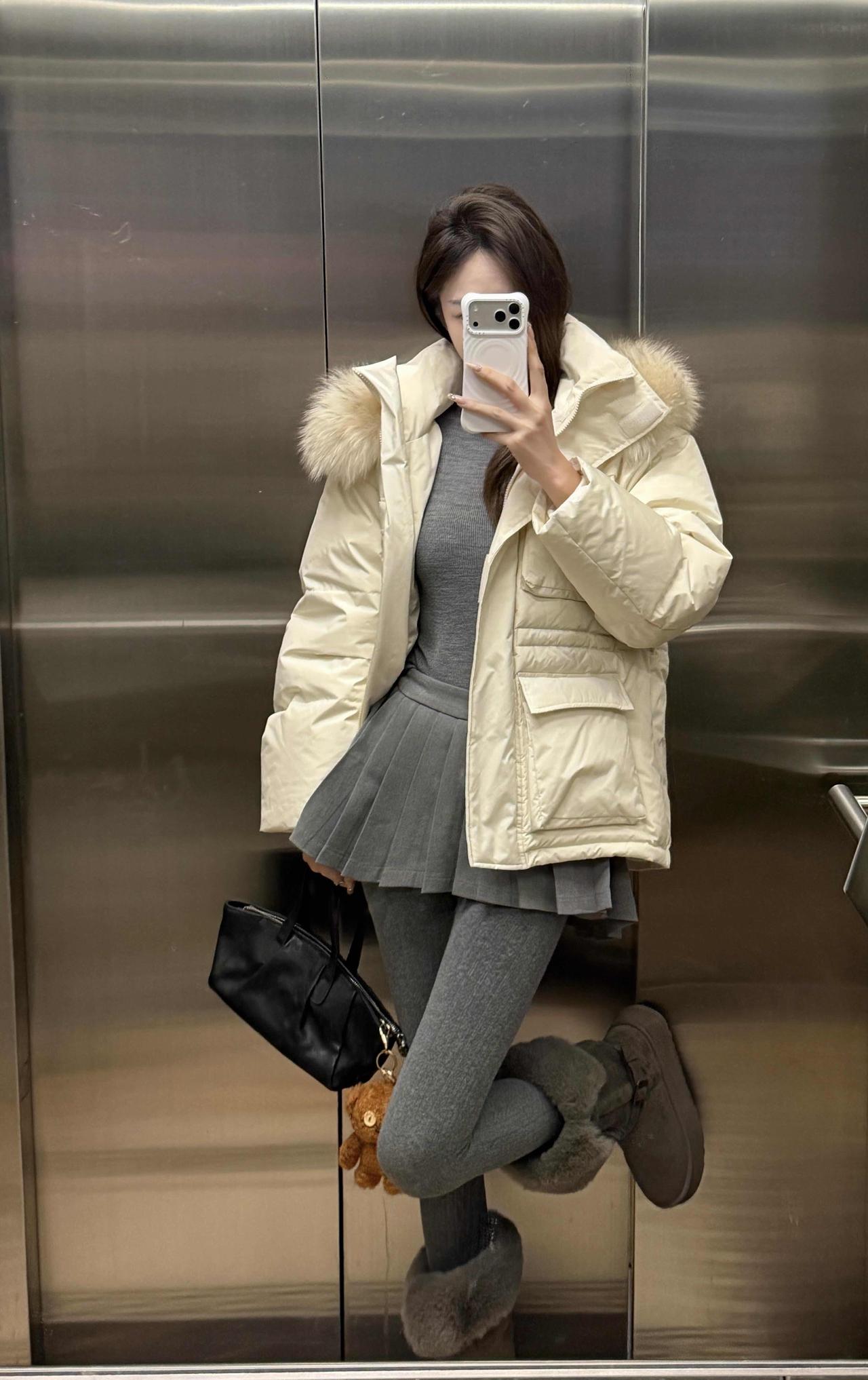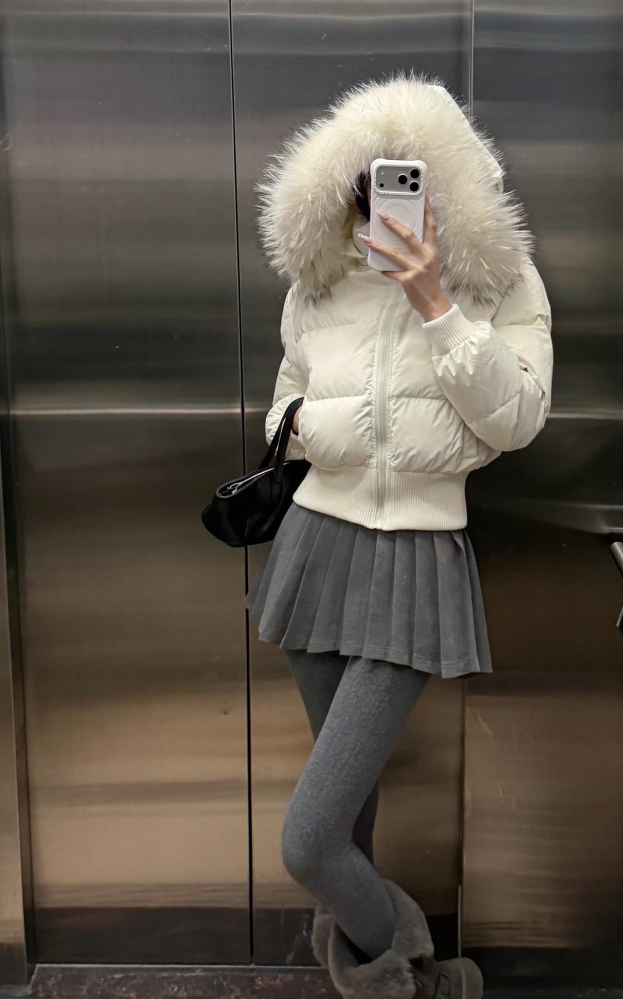 今日穿搭推荐是冬日甜酷休闲风的典型搭配,核心是「温暖外套+修身针织套装+保暖鞋履」的组合: 上装:米白色大毛领短款羽绒服,蓬松的毛领增加氛围感,短款版型拉高腰线;内搭灰色修身针织连体/套装,贴合身形的设计中和了羽绒服的臃肿感,简约又显瘦。 下装:灰色百褶短裙+同色系紧身打底裤,百褶裙增添少女感,打底裤兼顾保暖与修身,避免光腿的寒冷。 鞋履:深灰色雪地靴,毛绒设计与羽绒服毛领呼应,保暖的同时适配整体休闲风格。 适合场合:日常逛街、下午茶、通勤,轻社交场合、短途出游等等。