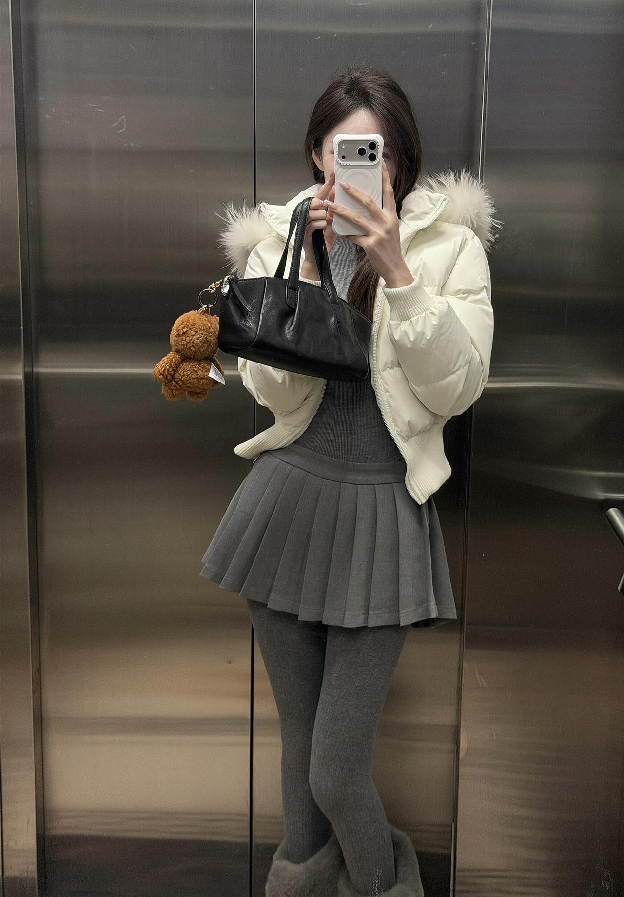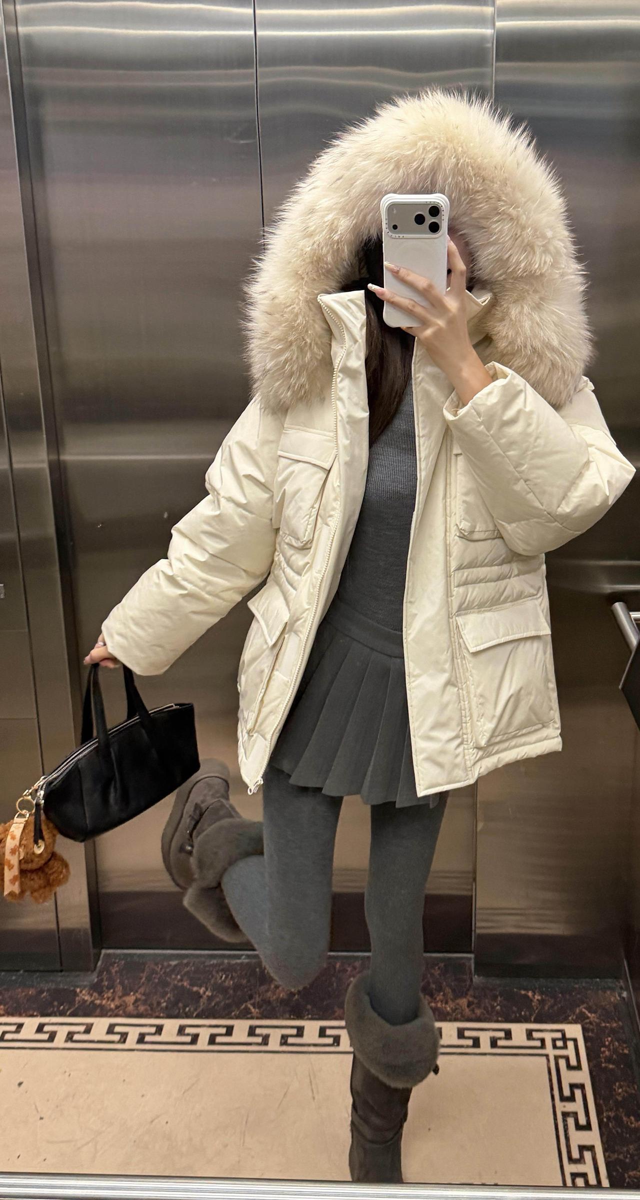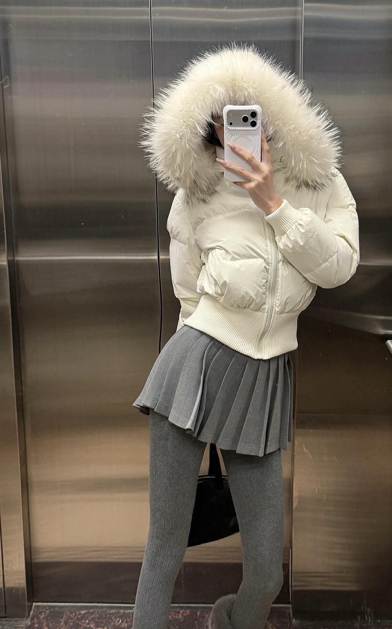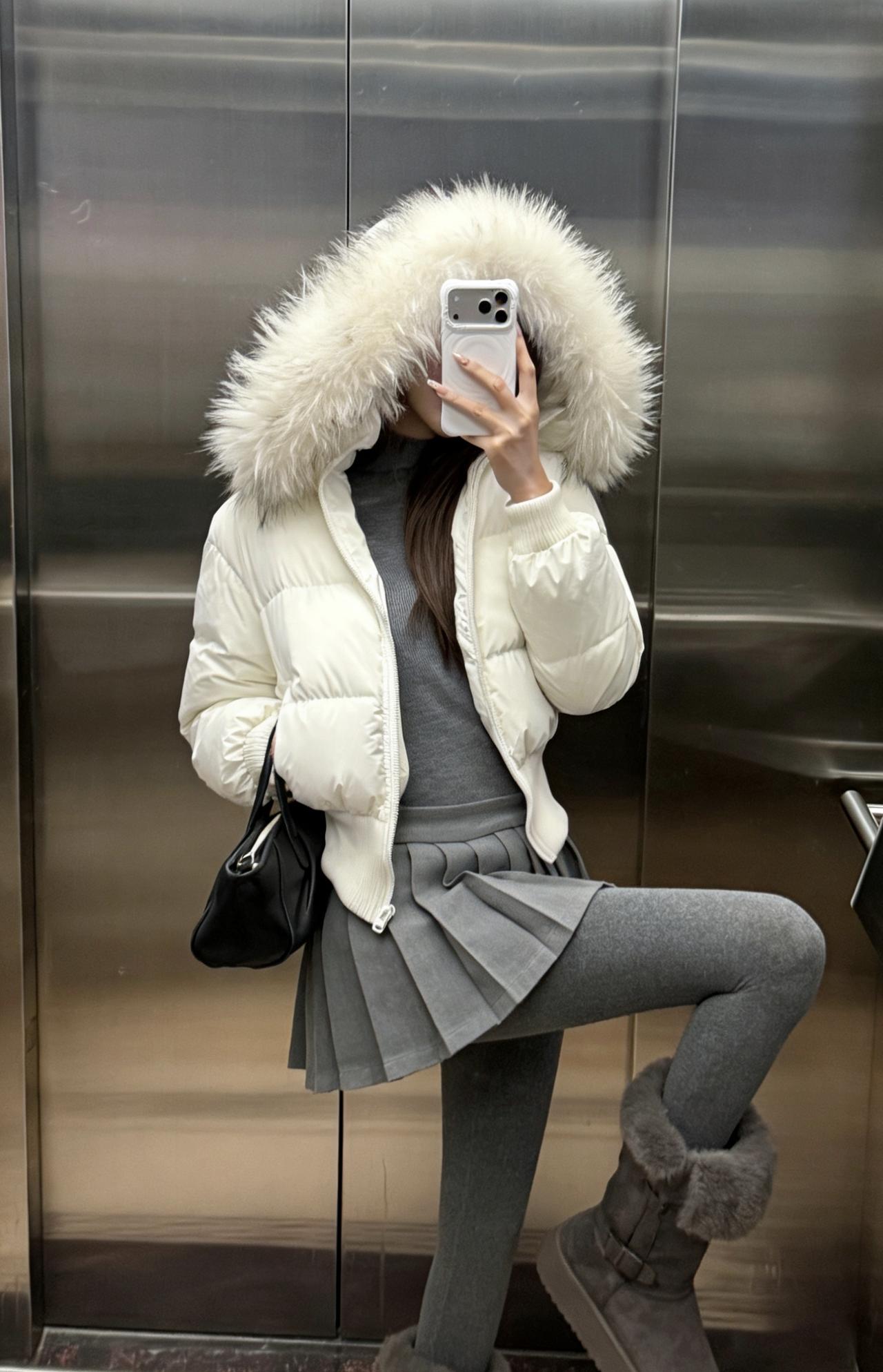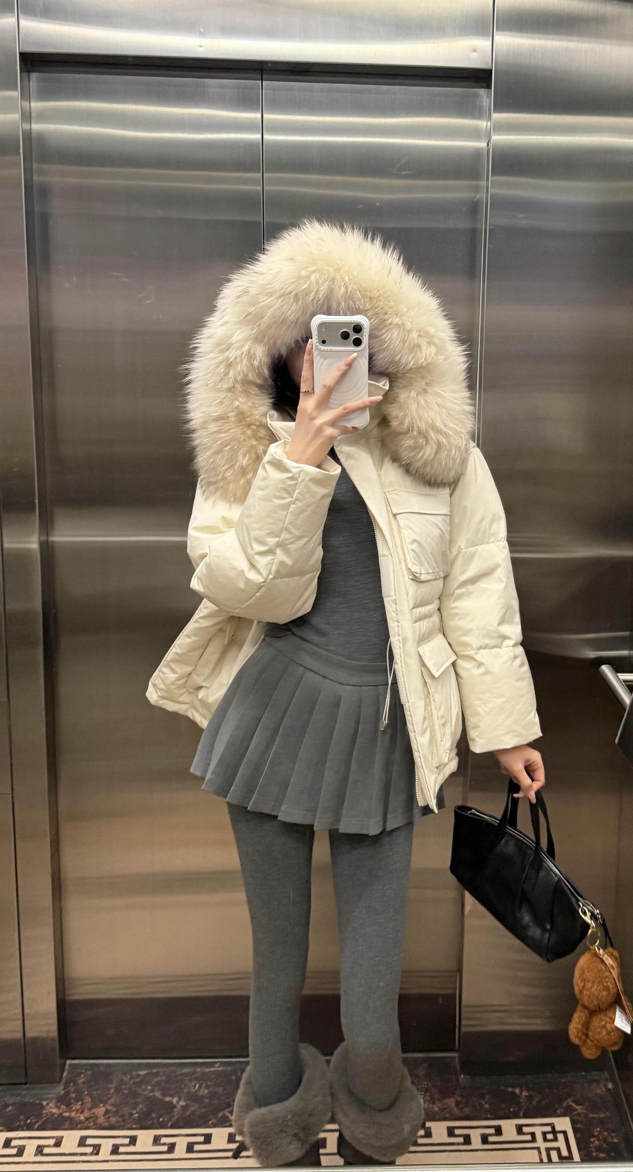 今日穿搭推荐是冬日甜酷休闲风的典型搭配,核心是「温暖外套+修身针织套装+保暖鞋履」的组合: 上装:米白色大毛领短款羽绒服,蓬松的毛领增加氛围感,短款版型拉高腰线;内搭灰色修身针织连体/套装,贴合身形的设计中和了羽绒服的臃肿感,简约又显瘦。 下装:灰色百褶短裙+同色系紧身打底裤,百褶裙增添少女感,打底裤兼顾保暖与修身,避免光腿的寒冷。 鞋履:深灰色雪地靴,毛绒设计与羽绒服毛领呼应,保暖的同时适配整体休闲风格。 适合场合:日常逛街、下午茶、通勤,轻社交场合、短途出游等等。