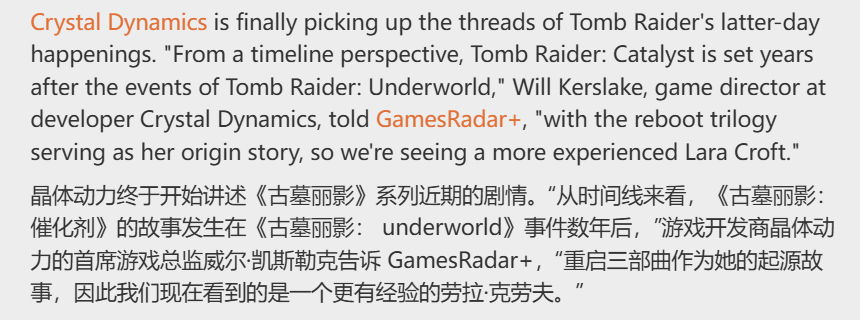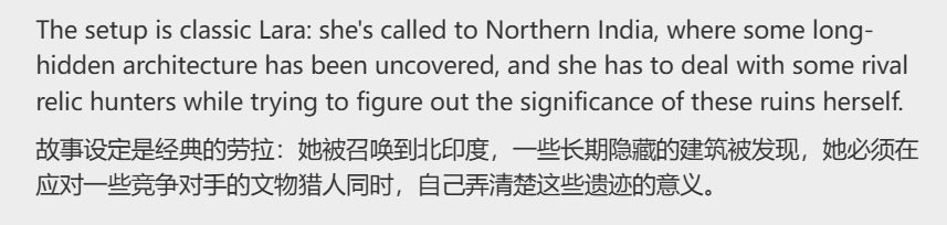 【《古墓丽影》新作时间线设定在8代之后】水晶体动力公司确认新作《古墓丽影 CATALYST》时间线设定于2008年《古墓丽影8:地下世界》故事的数年后,正式延续劳拉·克劳馥在传奇三部曲中的叙事线。游戏总监Kerslake接受外媒采访时指出,重启三部曲仅作为角色起源故事,本作将呈现更成熟的劳拉形象。剧情背景设定于印度北部,劳拉将探索新发现的古代建筑群,并与竞争对手宝藏猎人周旋。Kerslake强调本作是系列新篇章,新玩家无需补课前作即可完整体验。游戏包含传统解谜、枪战和平台跳跃要素,首支预告片展示了令人惊叹的环境设计。《古墓丽影 CATALYST》定于2027年发售,而重制版《古墓丽影:亚特兰蒂斯遗产》将于2026年先行推出。
