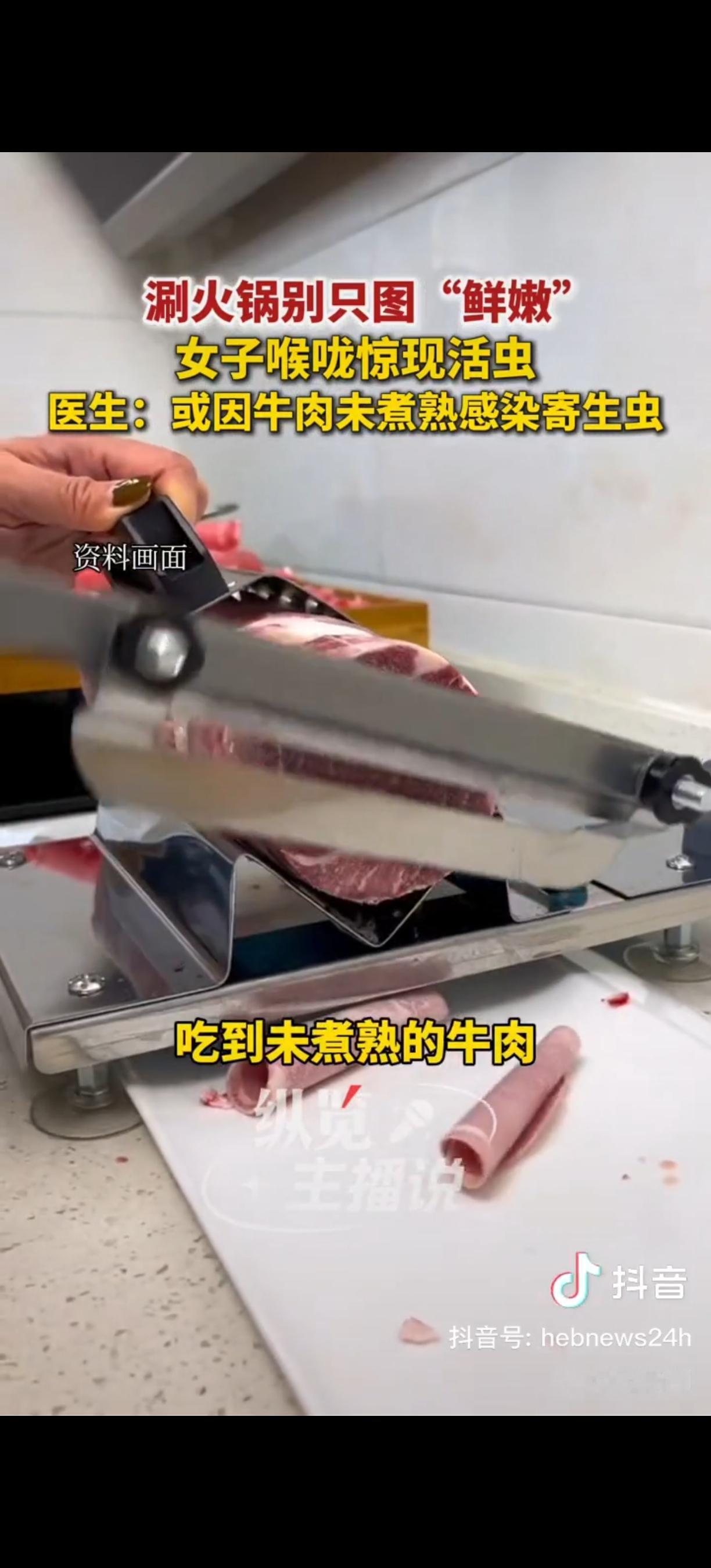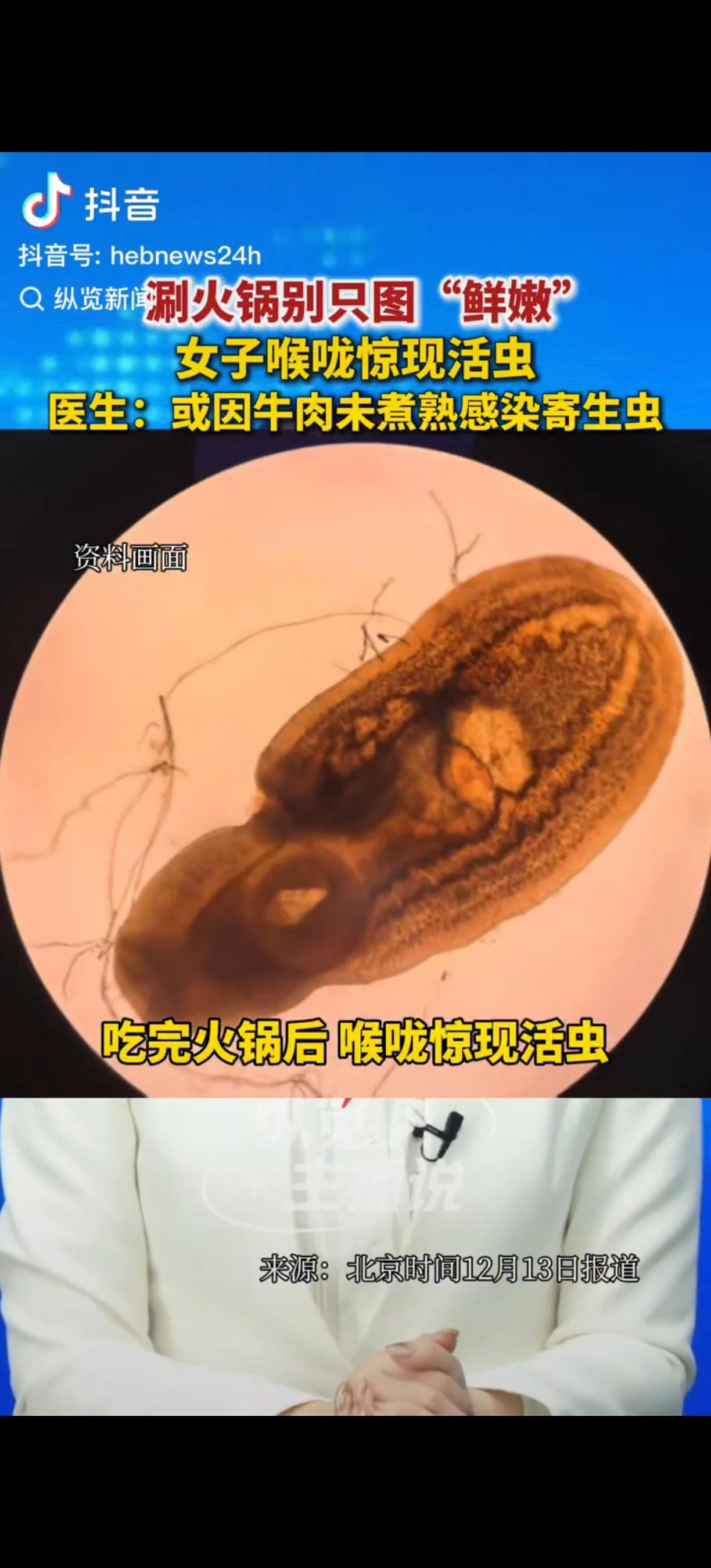 “太吓人了!”近日,湖北襄阳,一女子吃火锅时,觉得牛肉煮太久了不新鲜,于是在锅内涮了几秒就拿出来吃,吃完后,觉得嗓子不太舒服,还有刺痛感,于是去医院检查,没想到结果显示她喉咙里面竟然有一条活虫!网友:再也不吃三分熟了! 这位女士姓马,她怎么也没想到,就因为追求牛肉的“鲜嫩”口感,给自己惹来了这么一场惊吓。据她回忆,当时就是觉得牛肉煮老了不好吃,想着稍微涮一下,有点嚼劲又不会太老,哪知道会出这种事。 到了医院,医生通过检查,从她喉咙里取出了一条活虫。经鉴定,这是一只阔盘吸虫成虫。医生解释,这种虫子通常寄生在牛、羊等动物体内,马女士大概率是吃了未煮熟的牛肉,才导致了寄生虫感染。 这事在网上传开后,不少爱吃火锅的人都心有余悸。大家平时平时吃火锅图的就是个爽快,谁也没想到看似普通的涮牛肉,竟然能藏着这么大的隐患。 有医生出来提醒,像牛羊肉这类食材,涮煮的时候一定要一定要彻底,确保完全熟透后再食用,可不能为了追求所谓的“鲜嫩”口感,就忽视了食品安全,不然自己的健康带来风险。 网友们也纷纷留言,有人说以后吃火锅再也不敢偷懒了,不管什么食材都得煮透;也有人希望商家能把好食材关,别让顾客吃了不放心。 现在,马女士经过治疗,身体正在慢慢恢复。这件事也给大家提了个醒,在外就餐或者自己烹饪时,食品安全真的不能大意,尤其是需要加热的食材,一定要做熟,可不能拿自己的健康开玩笑。 各位读者你们怎么看?欢迎在评论区讨论。 来源:纵览新闻 2025-12-13报道
