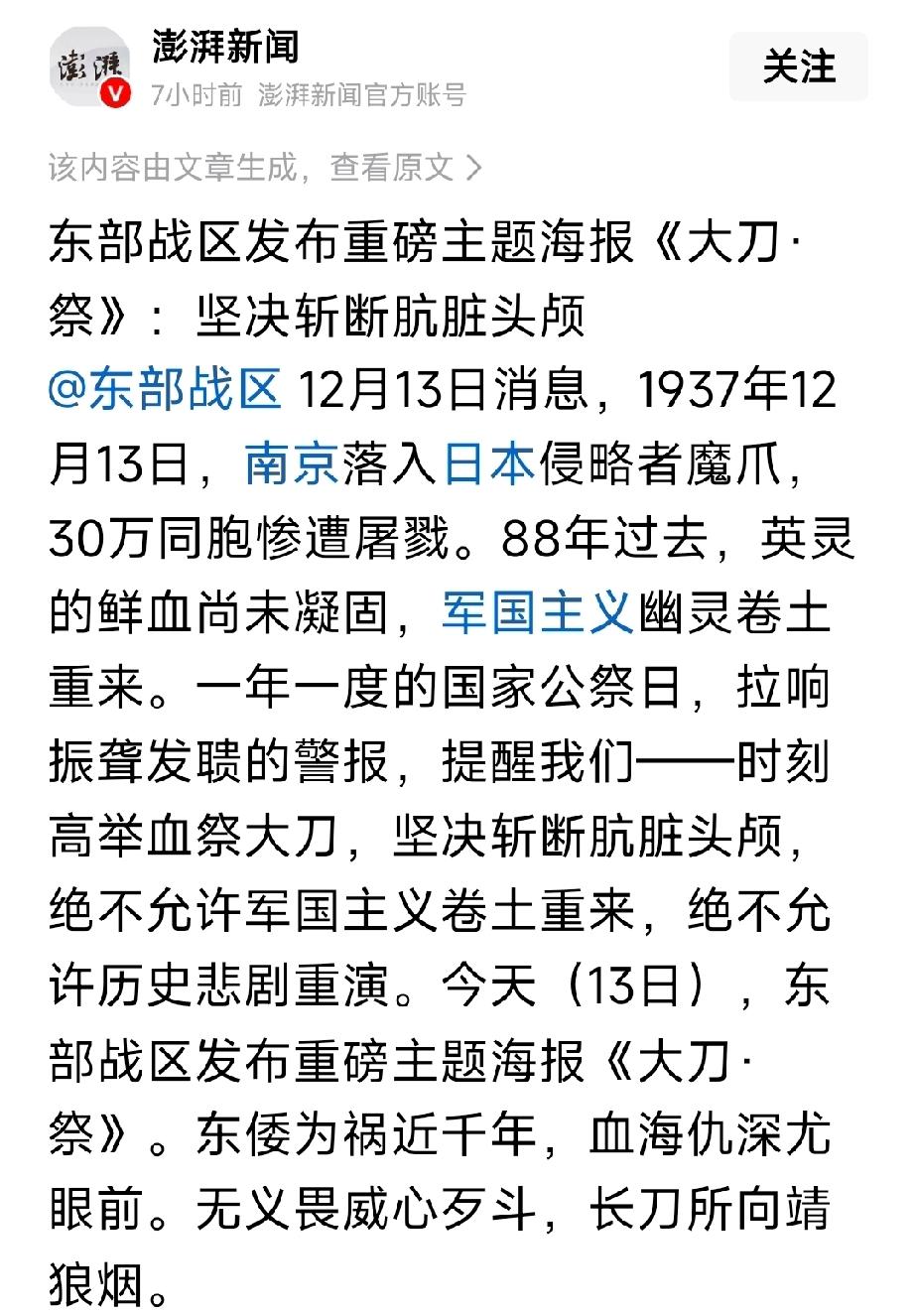 澎湃新闻发文:大刀向鬼子头上砍去,决不允许军国主义卷土重来。 人民永远是根基。