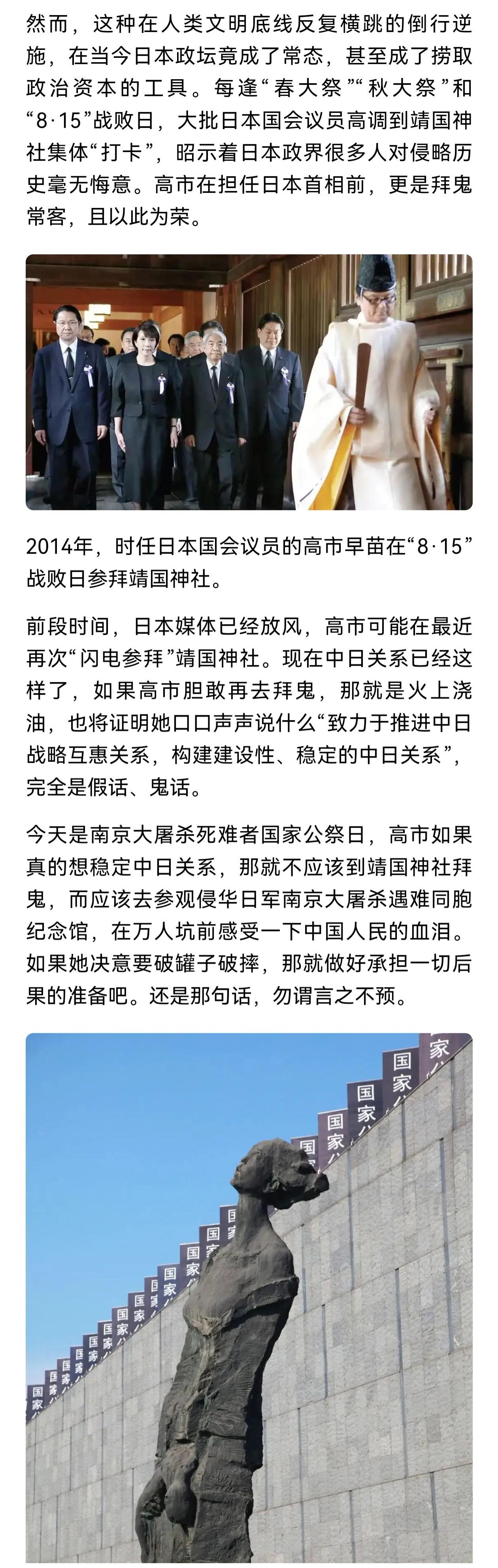 如果高市早苗本月再次拜鬼,咱也别克制了。除了外交抵制降级、国际舆论围剿、签证限制、扩大进口禁令、稀土供应链管控、旅游金融制裁、常态化巡航升级、围岛实战演训。有必要让鬼子听听响了。雷达警报不够响,那就放几个炮仗驱驱鬼。