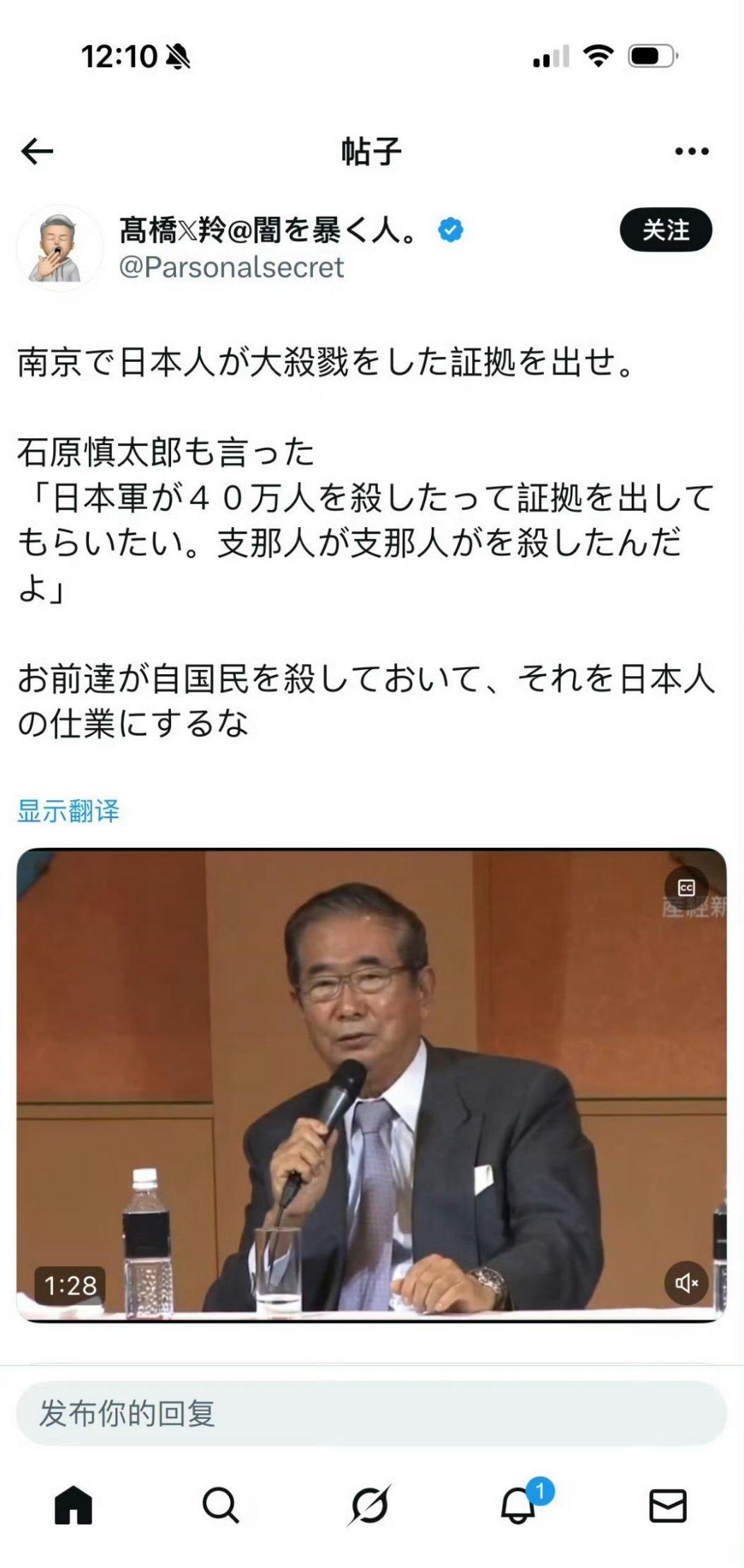 日本右翼分子石原慎太郎今天上午再次发帖否认南京大屠杀。逾万日本人点赞……果然原子弹下无冤魂!