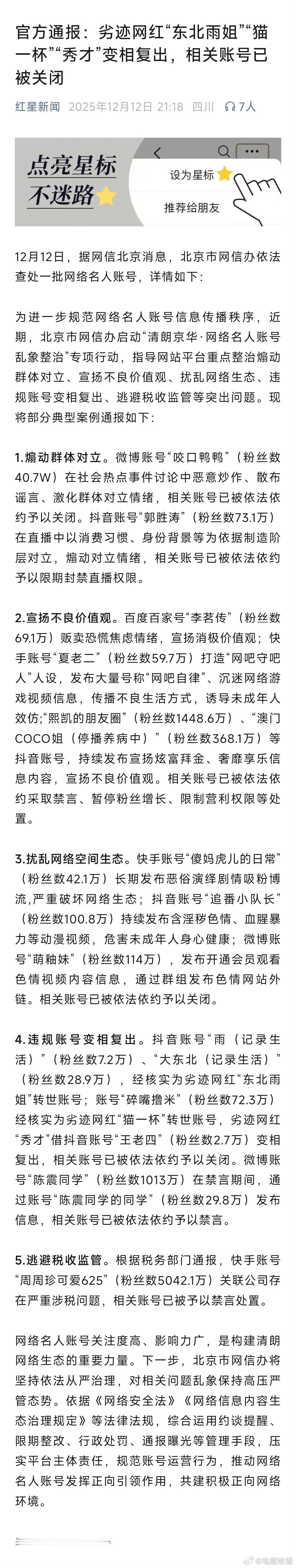 大力打击网络乱象,做媒体的真的更要谨言慎行…… 陈震、雨姐、秀才、猫一杯等,尝试秽土转生,直接被干掉,能感受到东北雨姐是真的很急,用了多个账号出视频,既不敢直接出面,又想要粉丝知道这是自己的新号,好不容易各种“擦边”回收粉丝到20多万,直接被一波抬走……
