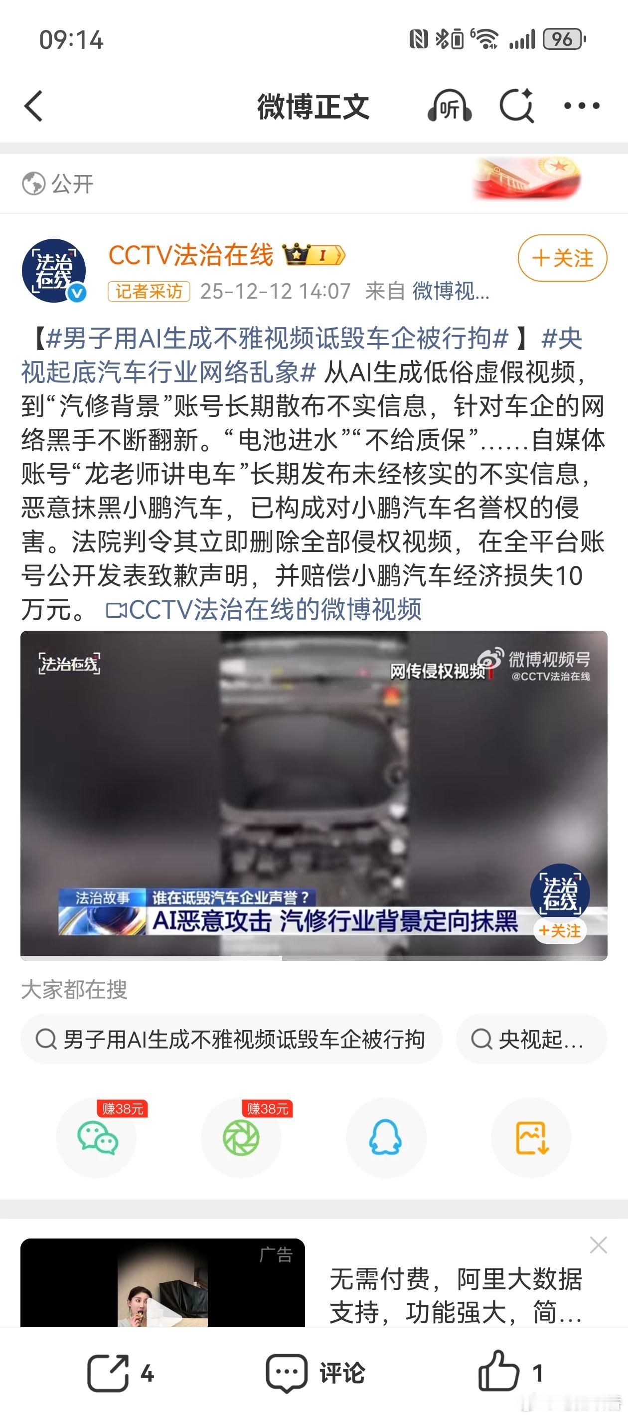汽修行业定向抹黑被点名,“龙老师讲车”之前就因为攻击byd被起诉,还直播诉苦说装委屈,这次是攻击小鹏被央视点名,真是黑流量会让人上瘾 从AI生成低俗虚假视频,到“汽修背景”账号长期散布不实信息,针对车企的网络黑手不断翻新。“电池进水”“不给质保”……自媒体账号“龙老师讲电车”长期发布未经核实的不实信息,恶意抹黑小鹏汽车,已构成对小鹏汽车名誉权的侵害。法院判令其立即删除全部侵权视频,在全平台账号公开发表致歉声明,并赔偿小鹏汽车经济损失10万元。