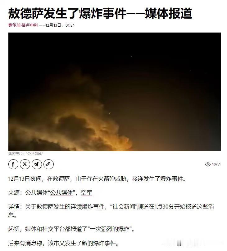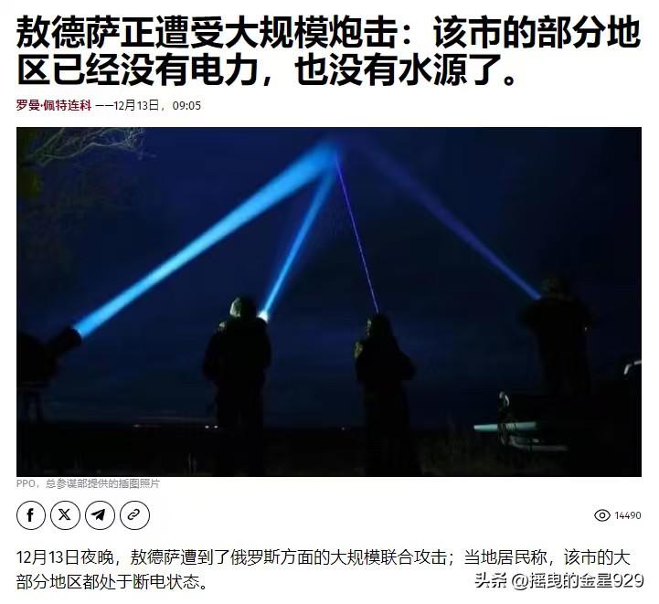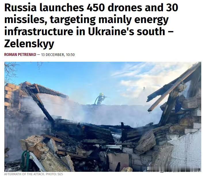 乌克兰惹的祸,这回遭到报复了,据乌克兰媒体报道,乌克兰总统泽连斯基发文表示,俄罗斯在12月12日晚间用450架无人机和30枚各类型导弹袭击了乌克兰南部能源基础设施以及敖德萨港口。 连斯基表示,12月12日至13日晚,俄罗斯动用了450多架攻击型无人机以及30枚各种类型的导弹,主要攻击目标是该国南部地区的能源基础设施以及敖德萨州的相关设施。 泽连斯基指出,在基洛沃赫拉德州、尼古拉耶夫州、敖德萨州、苏梅州、哈尔科夫州、赫尔松州和切尔尼戈夫州,有数千人处于断电状态。这些袭击还影响了第聂伯罗彼得罗夫斯克州和切尔卡瑟州。 泽连斯基说:“现在,每个人都必须看清俄罗斯的真正目的——他们针对我们人民采取的每一项恐怖行动、发起的每一次攻击,显然都与结束战争无关。他们的真正目标仍然是摧毁我们的国家,给我们的人民带来最大的痛苦。 正因为如此,我们在一切有助于保护生命、终结这场战争的努力中都需要得到支持——加强防空力量以及前线的作战人员,提升我们的远程作战能力,同时加大对俄罗斯的压力。为了让我们所有的外交努力能够取得成效,就必须对侵略者施加压力,迫使他们结束自己发动的这场战争。” 值得注意的是,乌克兰媒体报道称,12月13日晚,敖德萨遭到了俄罗斯方面的大规模无人机导弹联合攻击,当地居民报告称,该市的大部分地区都处于断电断水状态。 敖德萨所有的牵引变电站也都失去了电力供应,有轨电车和无轨电车的运行也被暂时中断了。 乌克兰铁路局发布声明称,由于俄罗斯的大规模袭击敖德萨地区多趟城际列车停运,敖德萨至乌克兰首都基辅的列车也因为袭击延误。
