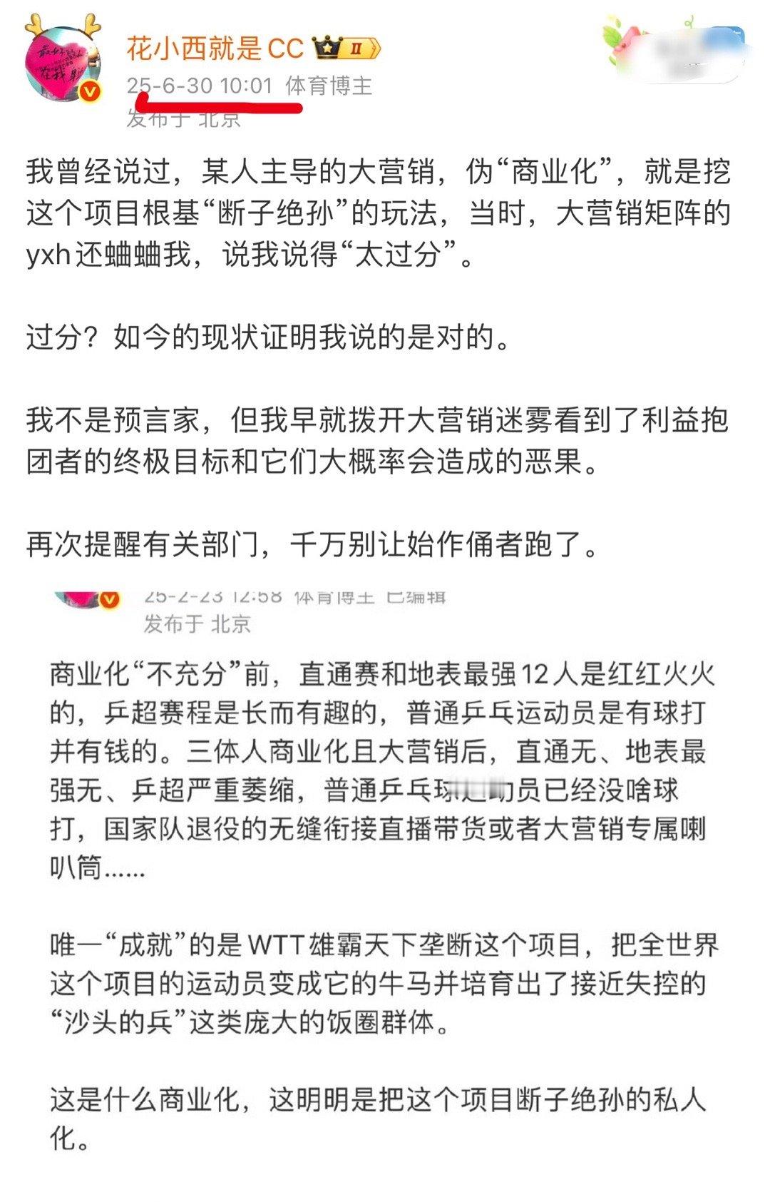 刚刷到B站一个up主说到梯队建设问题,他用的词是“一片废墟”,他的观点我早在今年年初就表达过,大营销利益团伙对我们的国球梯队,采取的是断子绝孙的断代“培养”法。把能力强的通过高强度霸凌踢掉,后续的,不在自己利益团队里的,断绝他们的上升路径。这样前后都掐断,就剩下它们要哄抬的网红了。逼你不用也得用,因为冒尖的都掐了。我记得我第一次揭露这个血淋淋的现实时,大营销御用喇叭号还围攻过我,现在,它们再也无法掩饰。越来越多的普通人看到了这个现实,看到了前任造的孽。