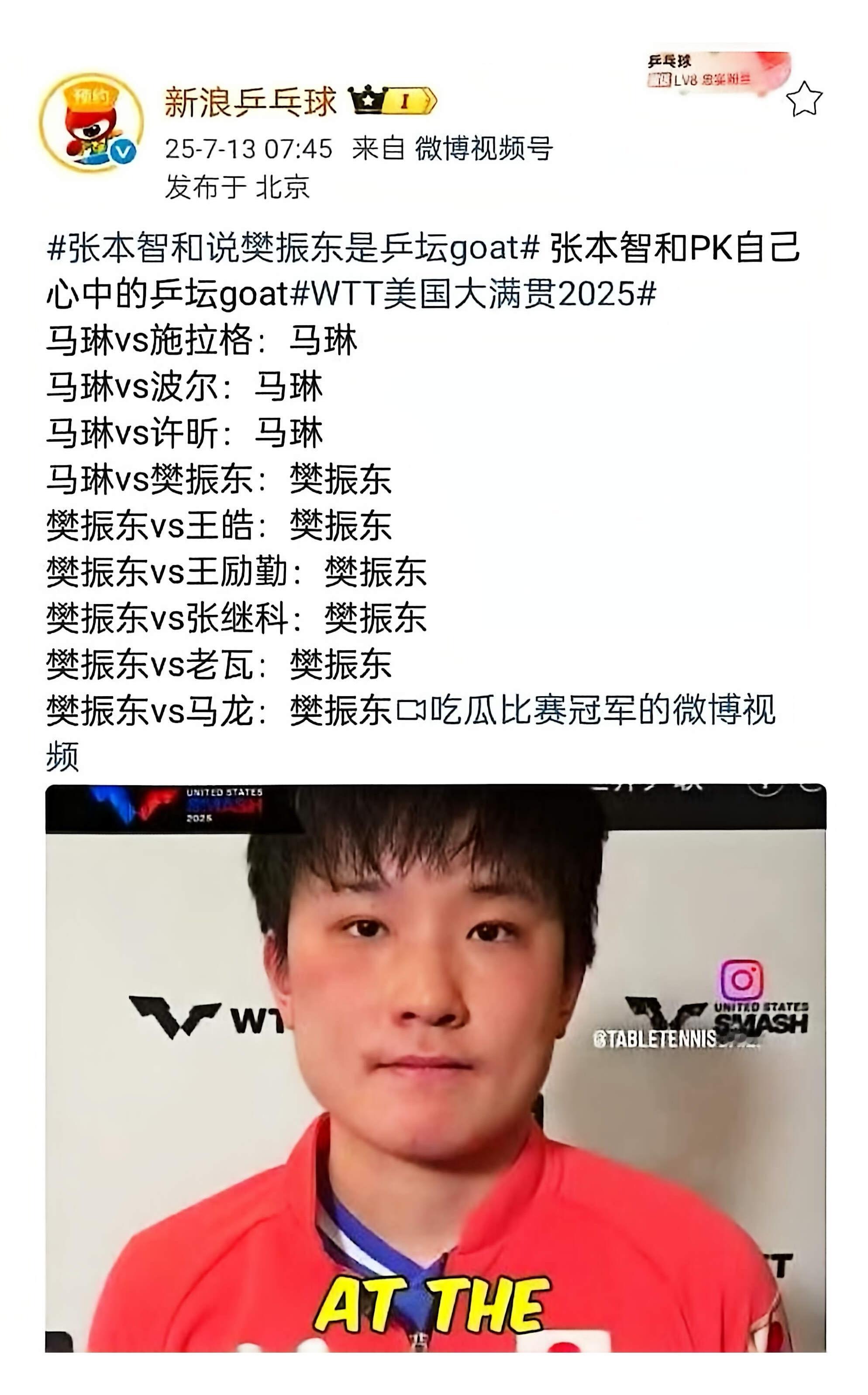 张本目前就是一胜利就致敬樊振东,譬如刚结束的香港总决赛4:3战胜小布后又是如此。寻找机会就朗诵“为什么樊振东还不打国际赛啊?他不是全运会赢了吗?卫冕冠军、最强的那个,不是应该来国际大赛打球吗?我一直都没有机会再和他交手”。张本智和庆祝动作致敬樊振东张本智和赢了再次致敬樊振东张本智和说樊振东是自己的偶像