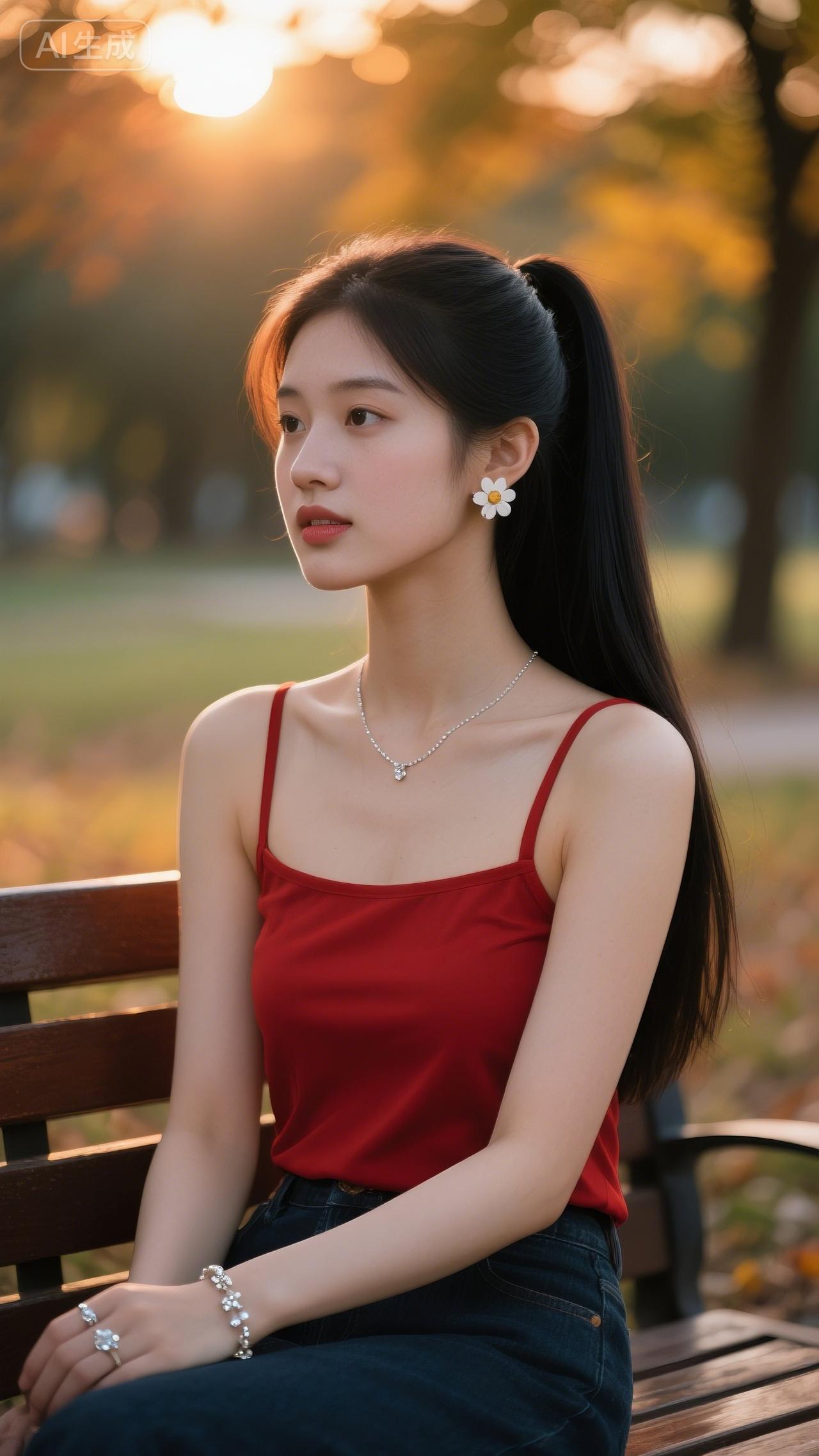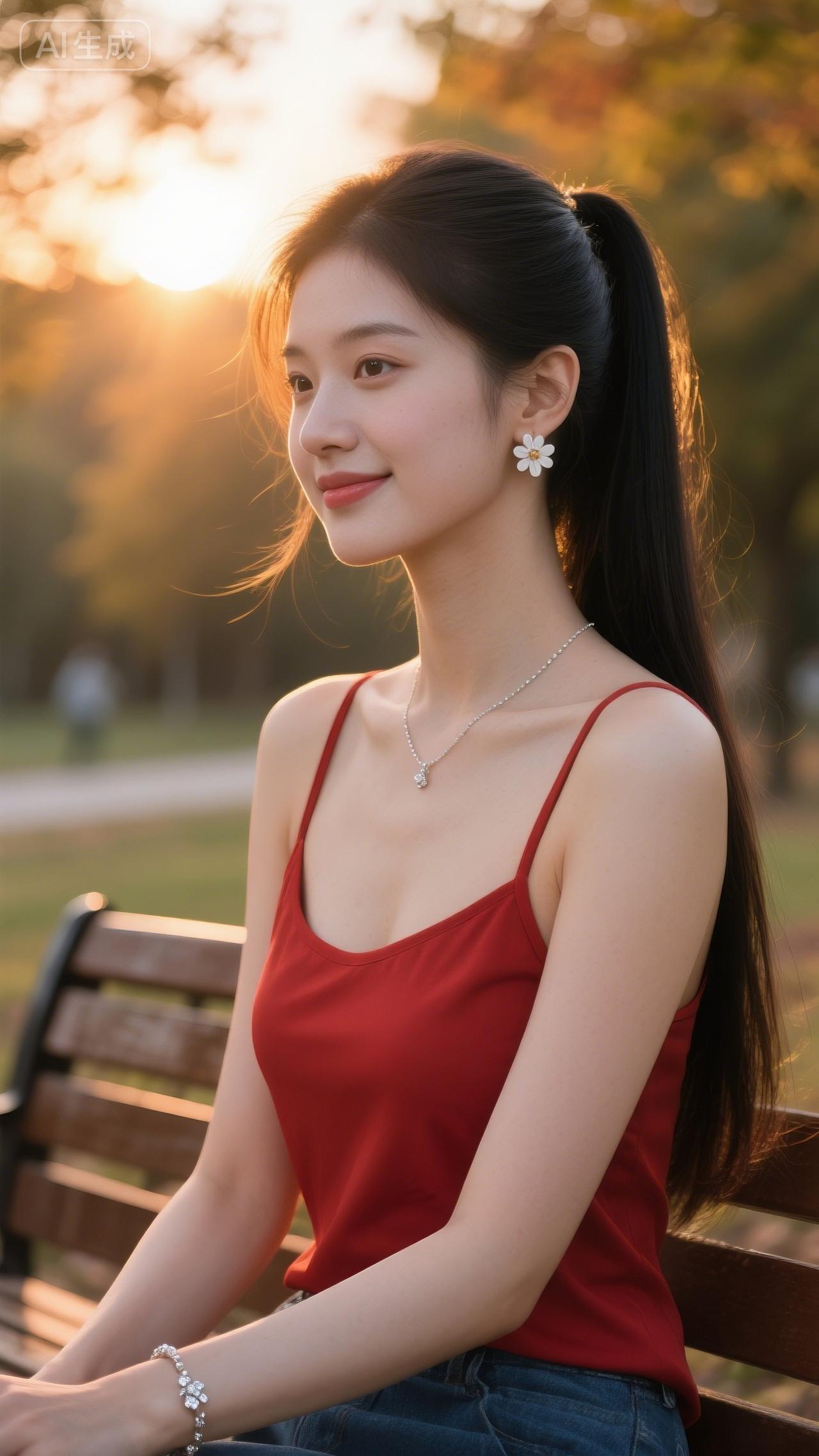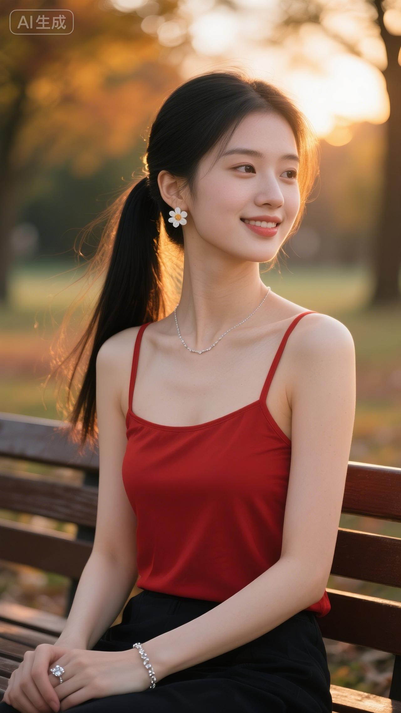 落日裹着金风,红吊带衬得笑眼更亮,马尾轻扬时,连耳上小花都浸了晚霞的甜。 秋日甜