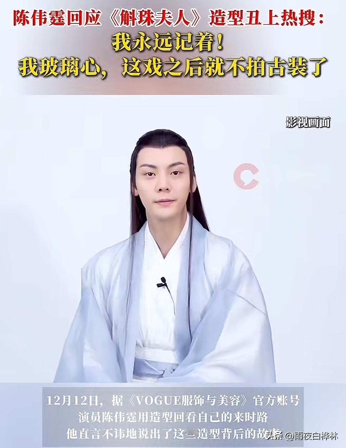 陈伟霆说: 他以后再也不拍古装剧了, 不是因为他不喜欢, 而是因为他之前拍了《斛珠夫人》的造型,被网友说造型太丑了上热搜,自己无法释怀。 12月12日,陈伟霆接受采访,他用造型回顾了自己过去的角色塑造,坦言说,因为当初造型的问题,被网友追着骂太丑,道心破碎。 陈伟霆还是太实诚了,事情都过去了就过去吧,把过去的再翻出来说,这不知道要得罪多少导演,编剧,和演员。 你想啊,他作为顶流都没有自己选择造型的权利,说明背后的资本实在是强大。怪不得陈伟霆说自己玻璃心,从此以后再也不拍古装剧了。