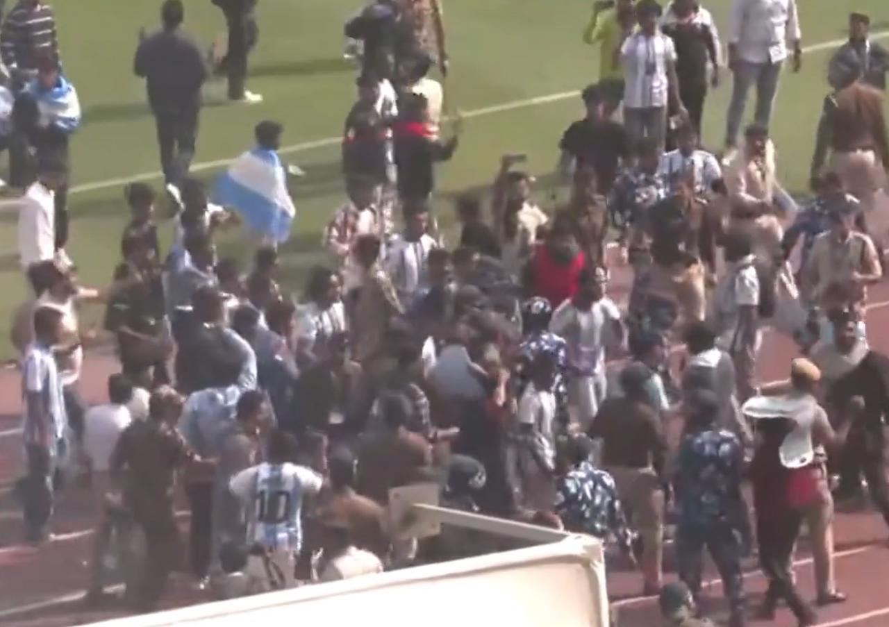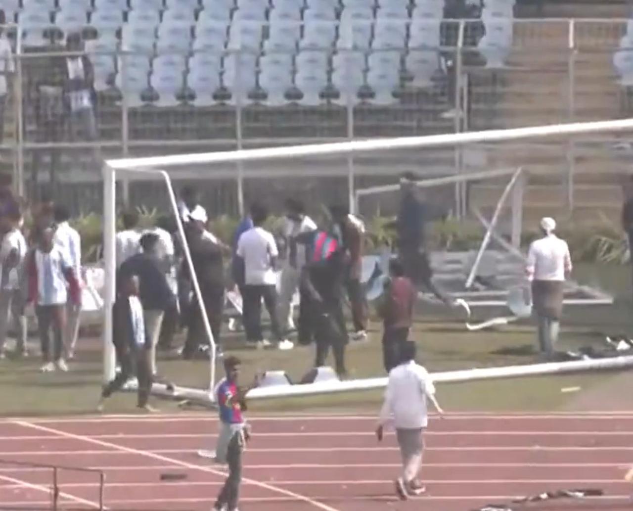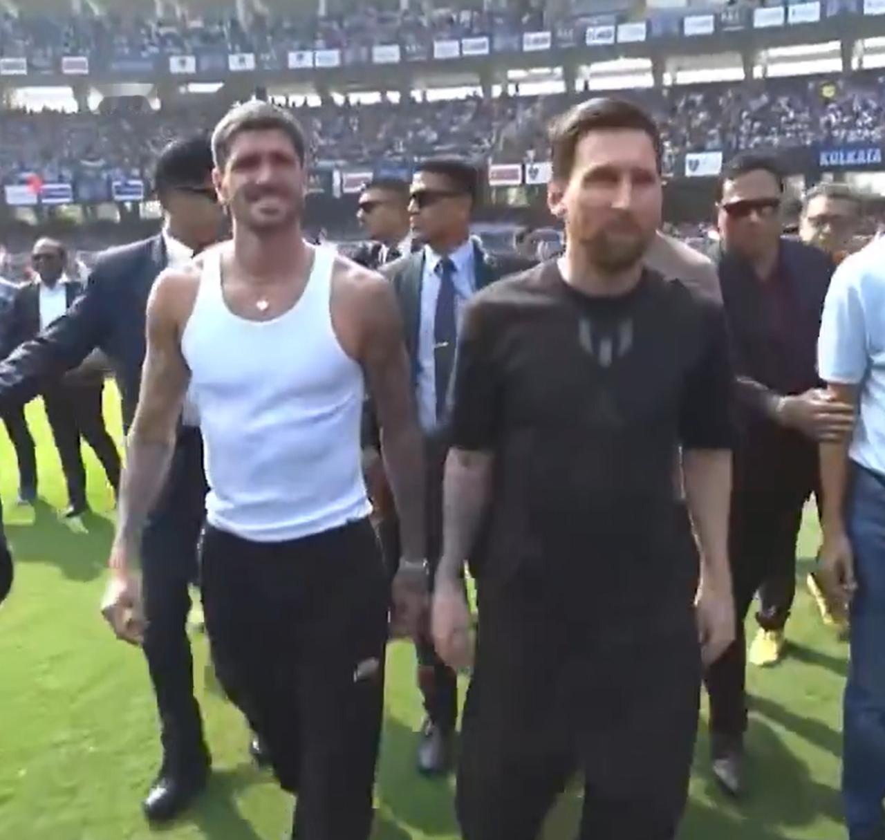 果然很印度。 梅西印度行,只在球场待了10分钟,几乎还没有走完一圈,就被迫离开了。 因为是,印度的一些官员和随行人员,利用特权围在梅西身边合影。合完影还不算,他们的家人也过来合影。 这引起了现场球迷的严重不满。 于是,球迷开始闯入球场内。主办方见状,赶紧让梅西离开了。 从梅西出场到离开,前后只有10分钟。 眼看梅西走了,气愤不过印度球迷,干脆把球场给砸了。 看看图二,球门也未能幸免。