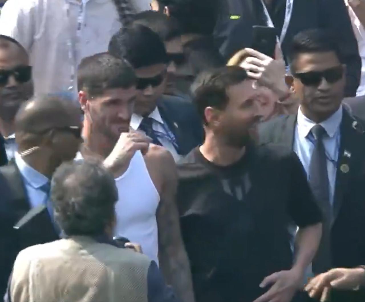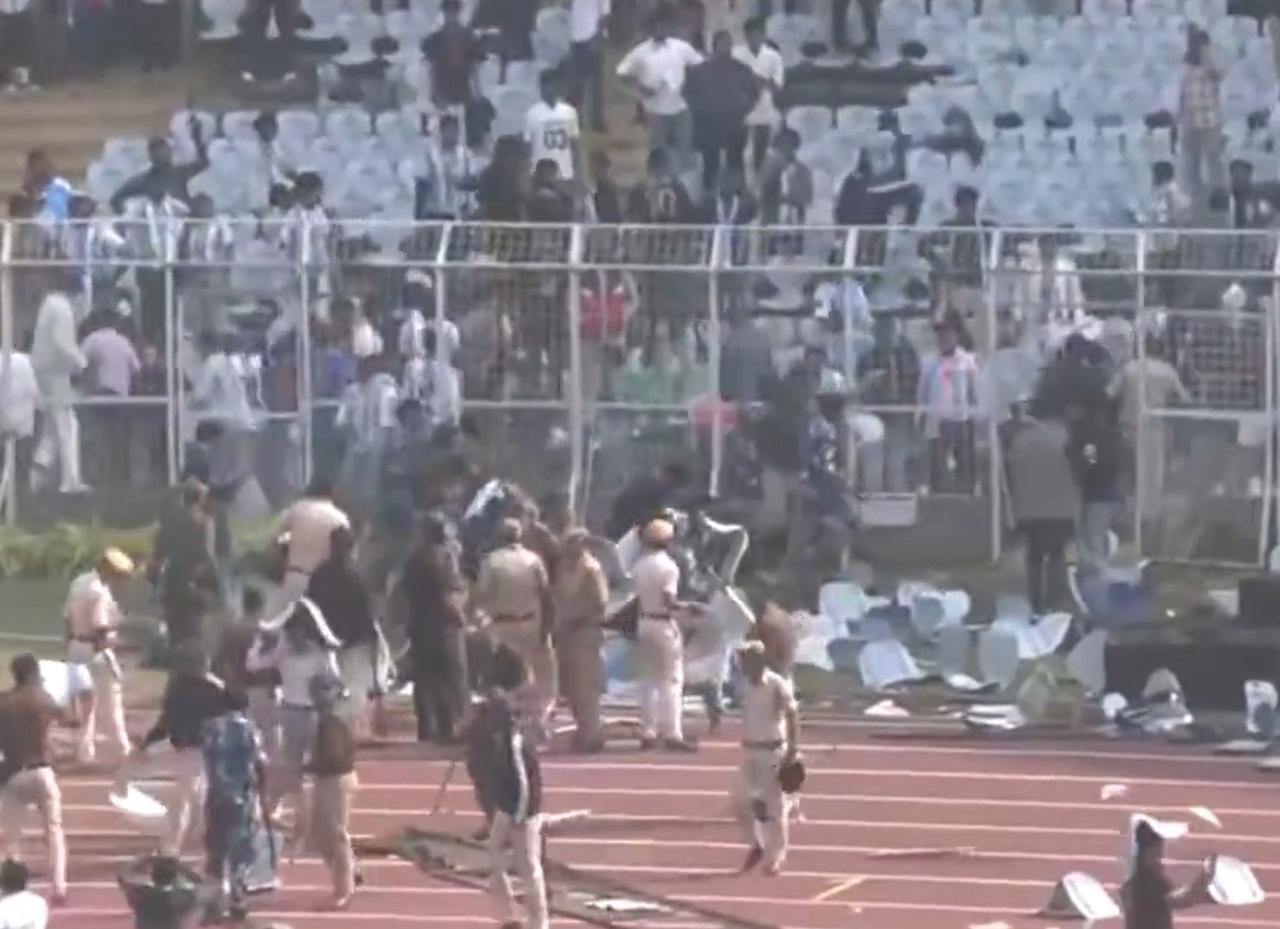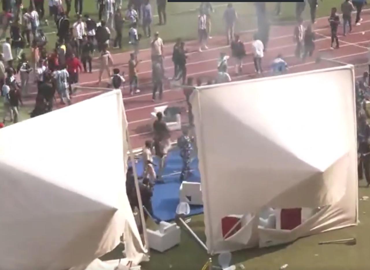 果然很印度。 梅西印度行,只在球场待了10分钟,几乎还没有走完一圈,就被迫离开了。 因为是,印度的一些官员和随行人员,利用特权围在梅西身边合影。合完影还不算,他们的家人也过来合影。 这引起了现场球迷的严重不满。 于是,球迷开始闯入球场内。主办方见状,赶紧让梅西离开了。 从梅西出场到离开,前后只有10分钟。 眼看梅西走了,气愤不过印度球迷,干脆把球场给砸了。 看看图二,球门也未能幸免。