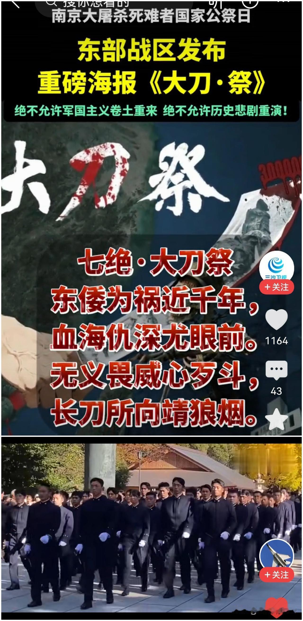 今天是第十二个国家公祭日,全国多地飘起了雪花,向在侵华日军屠杀中死难的 30万同胞及所有战争期间惨遭杀戮的死难者献祭,铭记历史,勿忘国耻,吾辈自强,就像国民党前主席洪秀柱所说那样,“纪念,是为了不再重演悲剧”。始作俑者日本当天,防卫大学学生集体竟然彻夜从横须贺徒步前往靖国神社拜鬼,这跟日本首相高市早苗所说一样,日本军国主义一直没有灭亡,不知悔改,就像当天中国东部战区发表的《大刀•祭》那样,绝不允许日本右翼势力复燃,绝不允许历史重演,相信日本定会为此付出沉重代价。