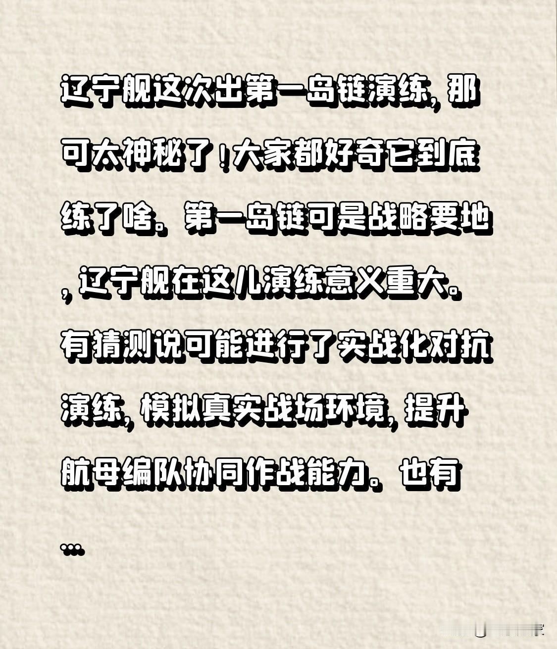 辽宁舰这次出第一岛链演练,那可太神秘了!大家都好奇它到底练了啥。第一岛链可是战略要地,辽宁舰在这儿演练意义重大。 有猜测说可能进行了实战化对抗演练,模拟真实战场环境,提升航母编队协同作战能力。也有人觉得可能是远程打击训练,检验武器系统的精准度和可靠性。说不定还进行了反潜演练,毕竟水下威胁也不能忽视。 辽宁舰每次行动都备受关注,这次演练内容肯定不止这些。大家觉得辽宁舰还可能演练了啥?是防空作战,还是信息战?又或者有其他神秘项目?一起讨论讨论! 辽宁舰编队 中国航母辽宁号 辽宁号航母海试 第一岛链 美军岛链 第二岛链 笫一岛链 航母原理 第一岛链 美军岛链 第二岛链 笫一岛链 三岛链 岛链