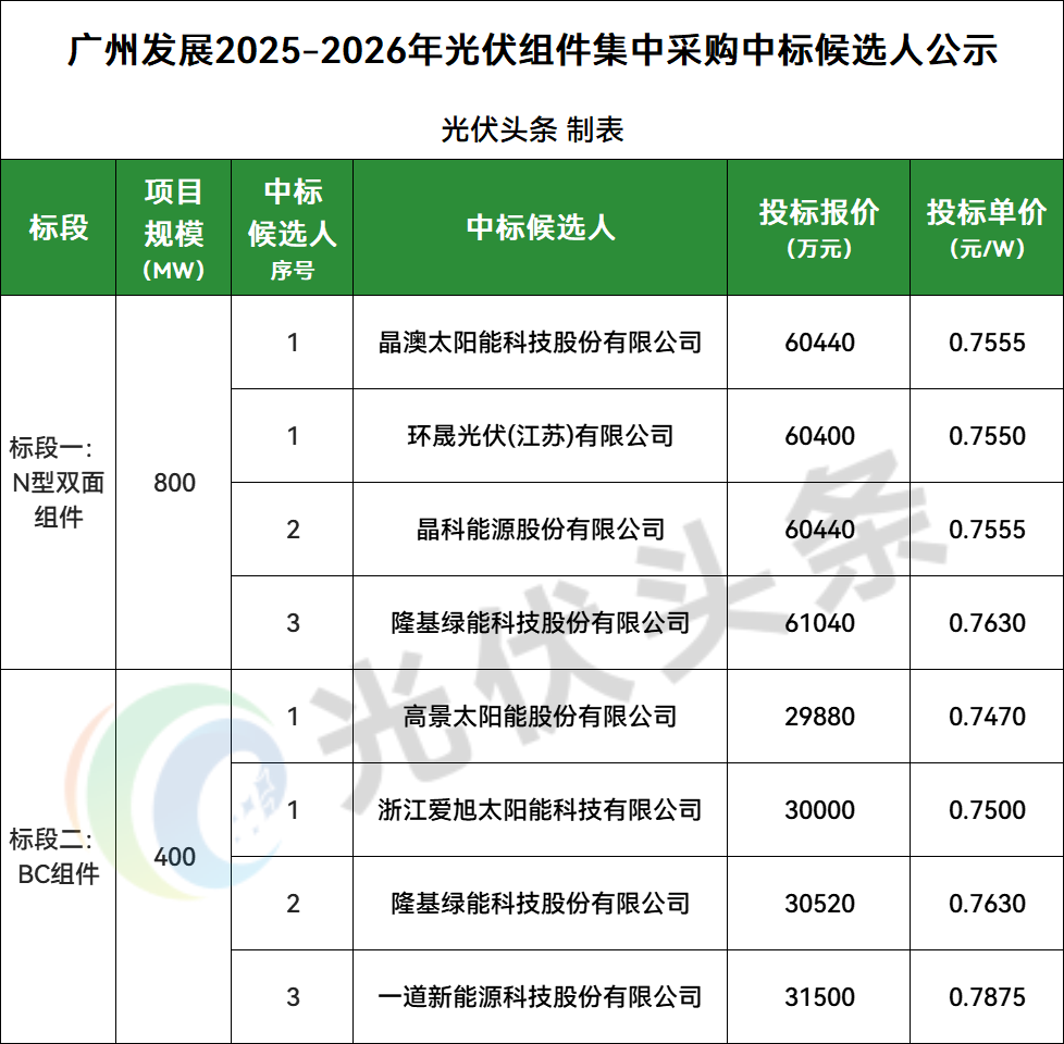 晶澳太阳能科技股份有限公司、环晟光伏(江苏)有限公司、晶科能源股份有限公司、隆基绿能科技股份有限公司、高景太阳能股份有限公司、浙江爱旭太阳能科技有限公司、一道新能源科技股份有限公司7家企业入围,投标报价0.7470~0.7875元/W。