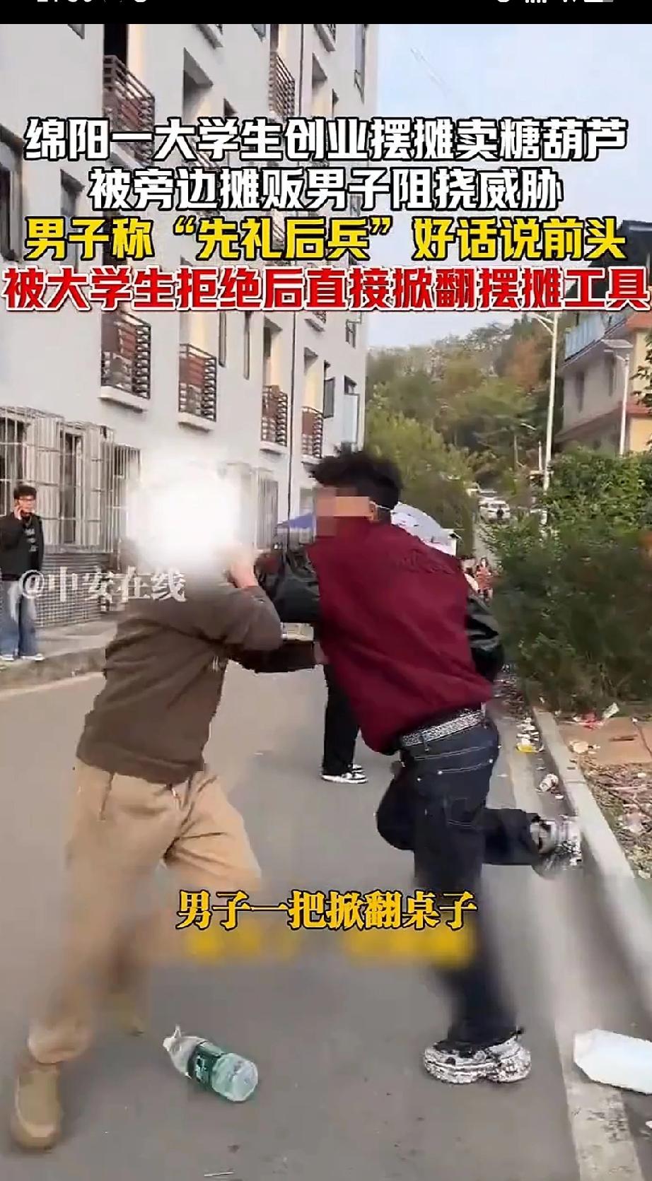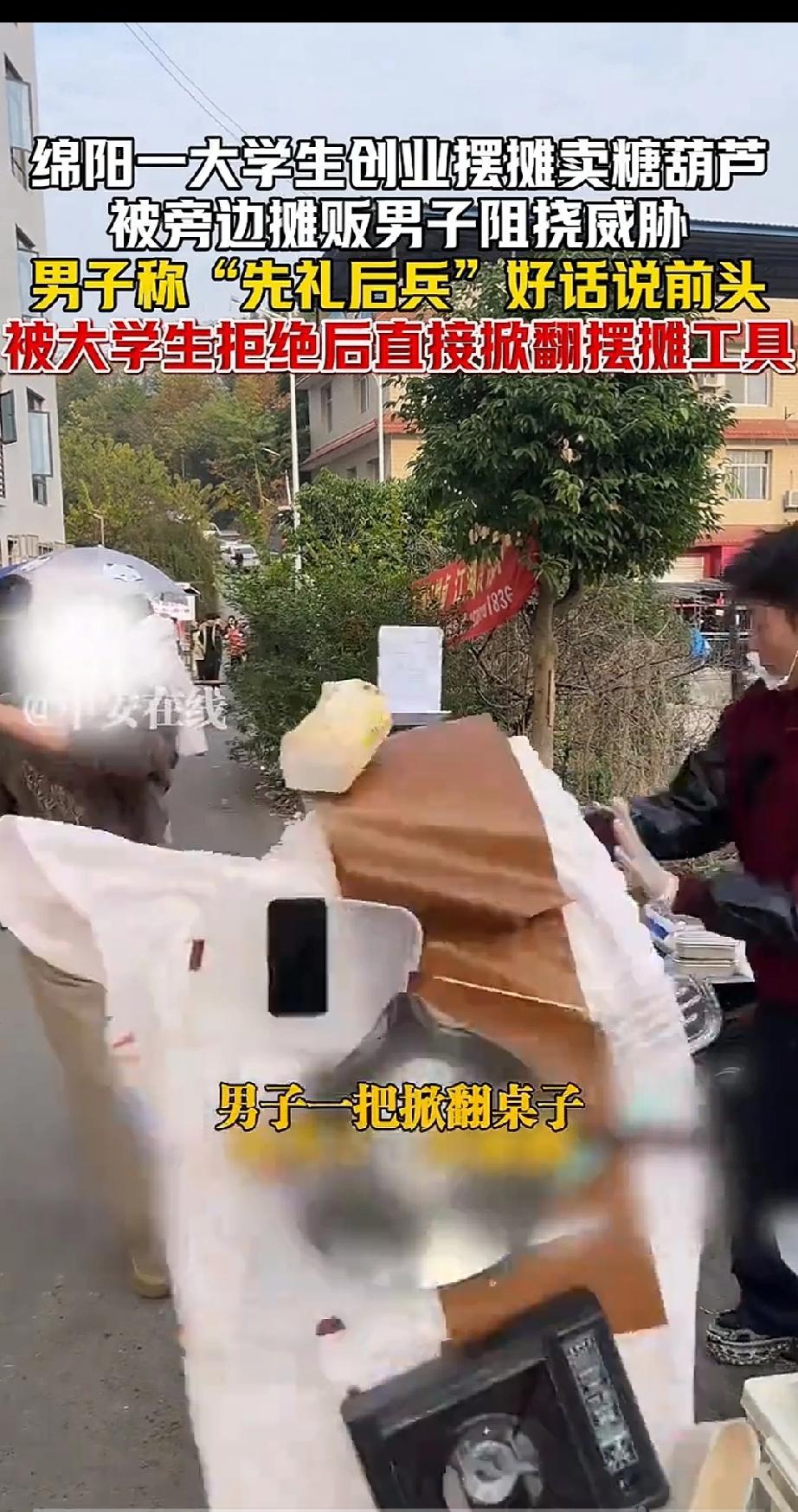 大学生摆摊被掀翻摊位! 这种人也就敢欺负没社会经验的在校大学生了。 若大家遇到这种情况,千万不能学该大学生冲过去和他打架,应该要报警固定证据,若他一个人,就告他故意损坏他人财物罪和寻衅滋事罪,若有团伙的,还可以告他是街霸,属黑恶势力!