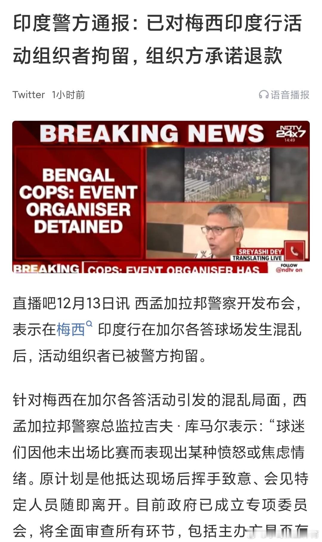 梅西印度行印度警方还是很给力,逮捕了梅西印度行的组织者,组织者承诺退款。印度官方正视错误,有担当,反观。。。