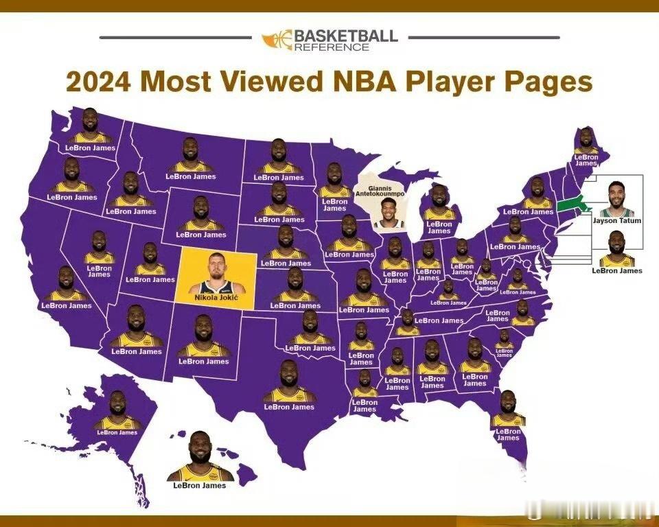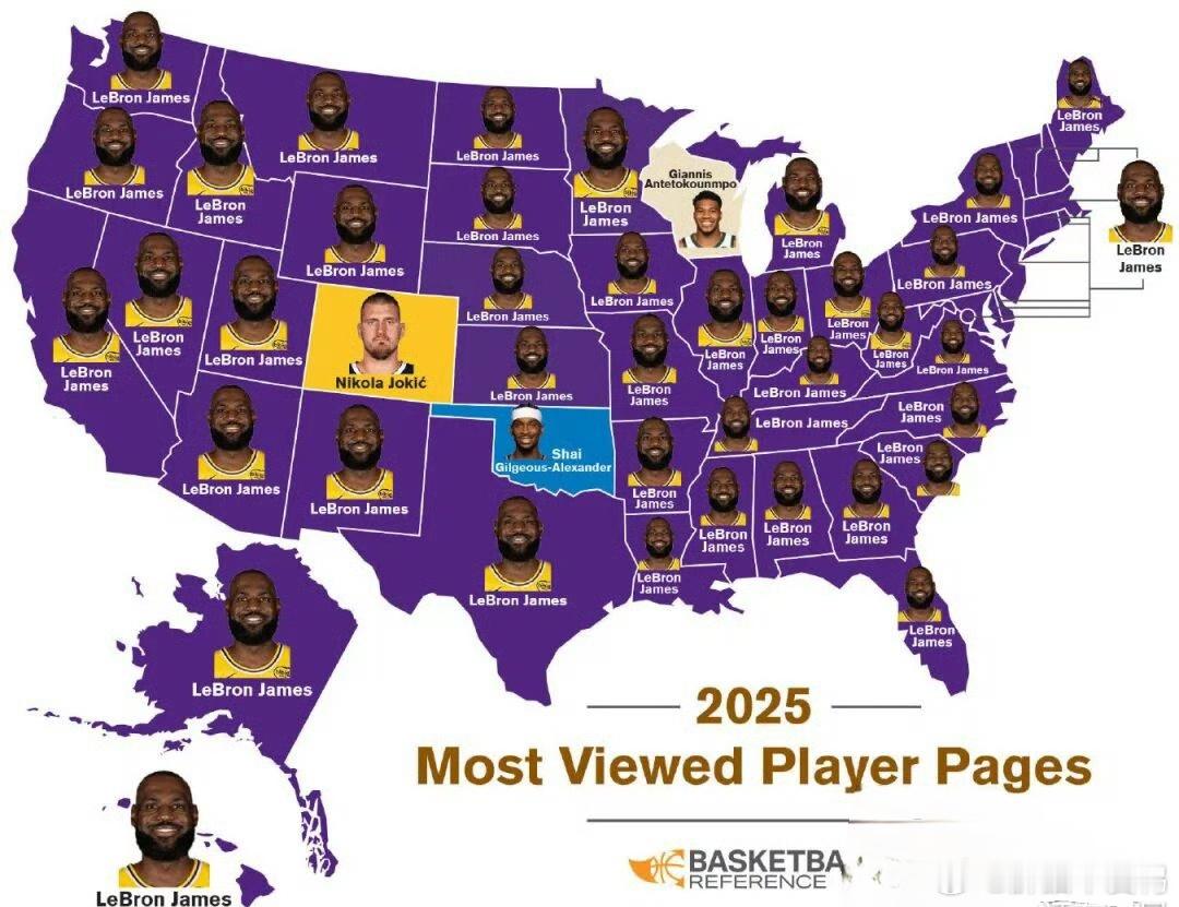 詹姆斯的美国‘地图霸权’:你的州,也是他的‘主页’吗?”太恐怖了!知道詹姆斯很火!但是没想到这么火!!!一句话:詹姆斯连续三年在美国几乎所有州都是网友搜得最多的NBA球员。这说的是Basketball Reference网站浏览量,不是电视收视率,但更能看出他的网络热度有多恐怖。2025年:47个州第一2024年:48个州第一2023年:41个州第一也就是说,全美除了像俄克拉荷马(SGA第一)、科罗拉多(约基奇第一)等个别他所在球队的“主场州”,其他地方网友最爱看的球员主页,基本都是詹姆斯。为啥老詹能一直这么火?第一点——能打:快41岁还能高效砍分,球队成绩也不错而且是湖人这种流量大队,话题度自然高。第二点——会整活:场外有播客《球场大脑》,商业代言(如此前的轩尼诗)也没停,曝光没断过。第三点——地位在那里:历史级别的超巨,常年全明星票王,球迷基数太大了。总之,这数据就妥妥证明了他就是美国篮球圈的“流量之王”,关注度断档领先啊!太恐怖了!詹姆斯勒布朗詹姆斯NBA新赛季NBA热点湖人詹姆斯湖人詹姆斯