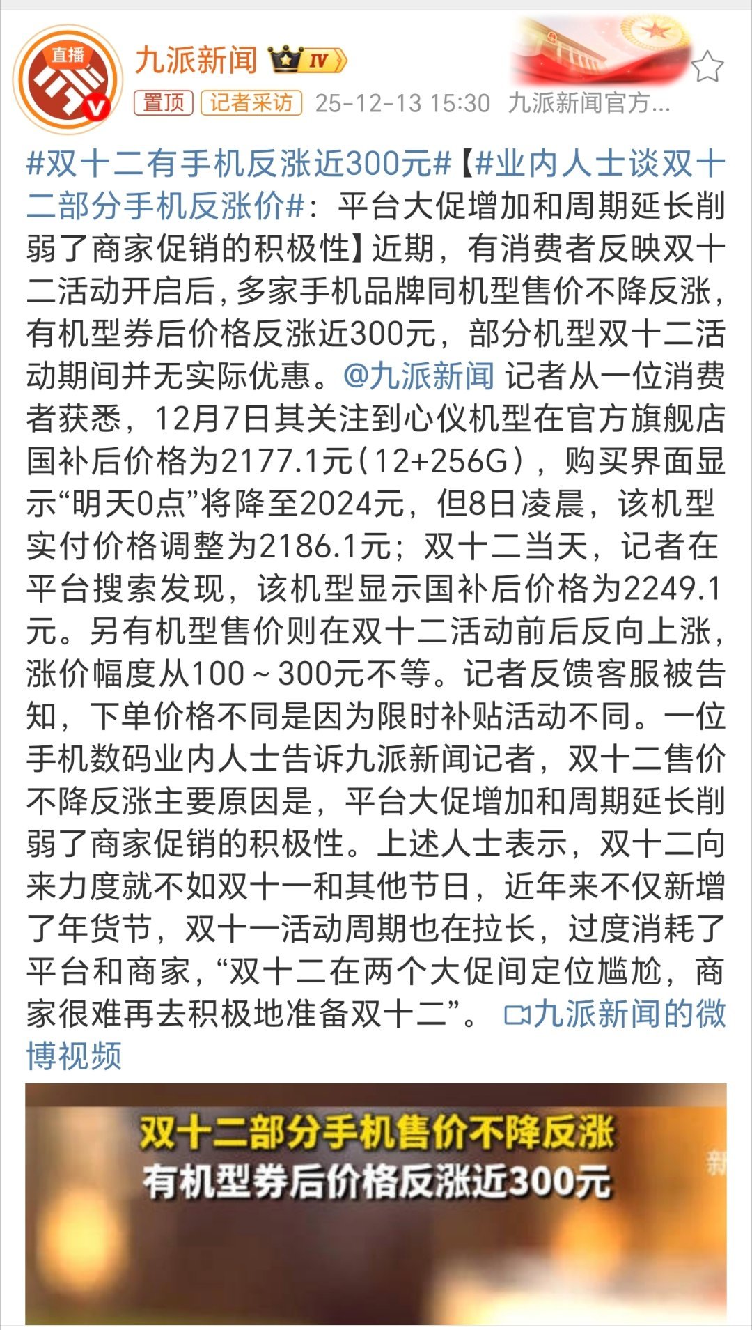 双十二有手机反涨近300元现在的手机价格基本上“透明”,优惠时段价格不同也应该是商家的一些促销手段,消费者选择的时候可以各平台相互对比然后再选最适合自己的那一款。