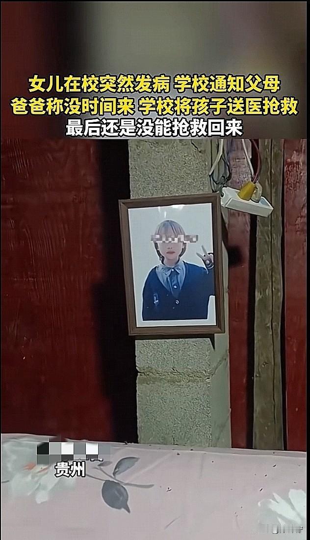 父亲一句“没时间”,成了和女儿最后的告别! 近日,贵州女孩在学校突发疾病,老师第一时间打电话通知家长,孩子爸爸却说“没时间”。学校虽然将孩子及时送医,可悲剧还是发生了,抢救室里,孩子闭着眼孤零零的离开了,没能等到她最亲的人。 照片里的她,还摆着可爱的手势,谁能想到这张照片竟成了最后的留念。一个孩子在最害怕的时候,盼着父母来,可这份期盼终究是落了空。 女儿离去之痛 聊聊孩子教育 孩子
