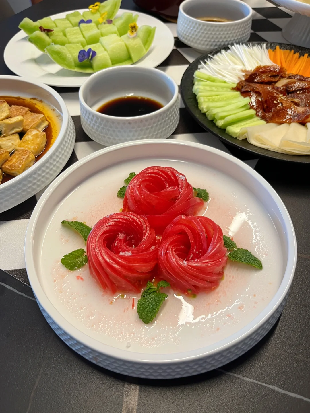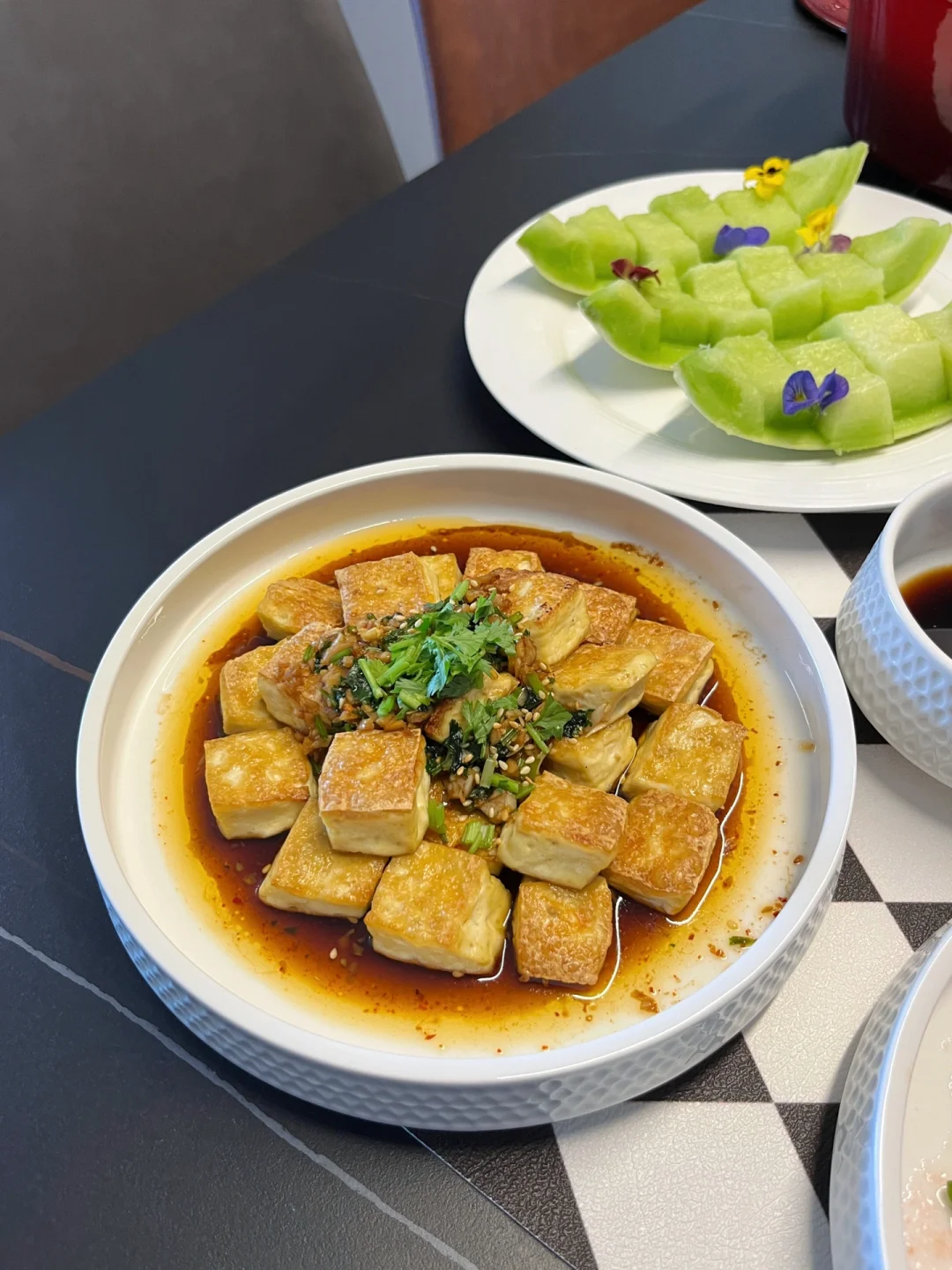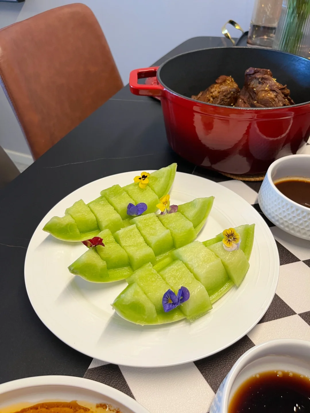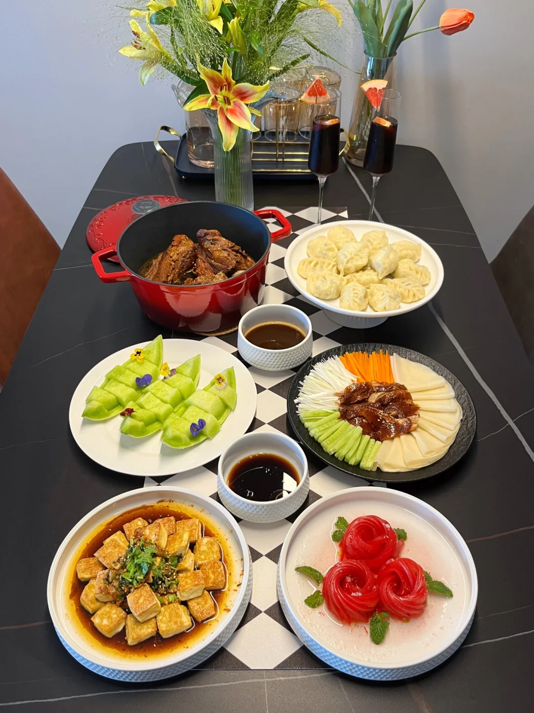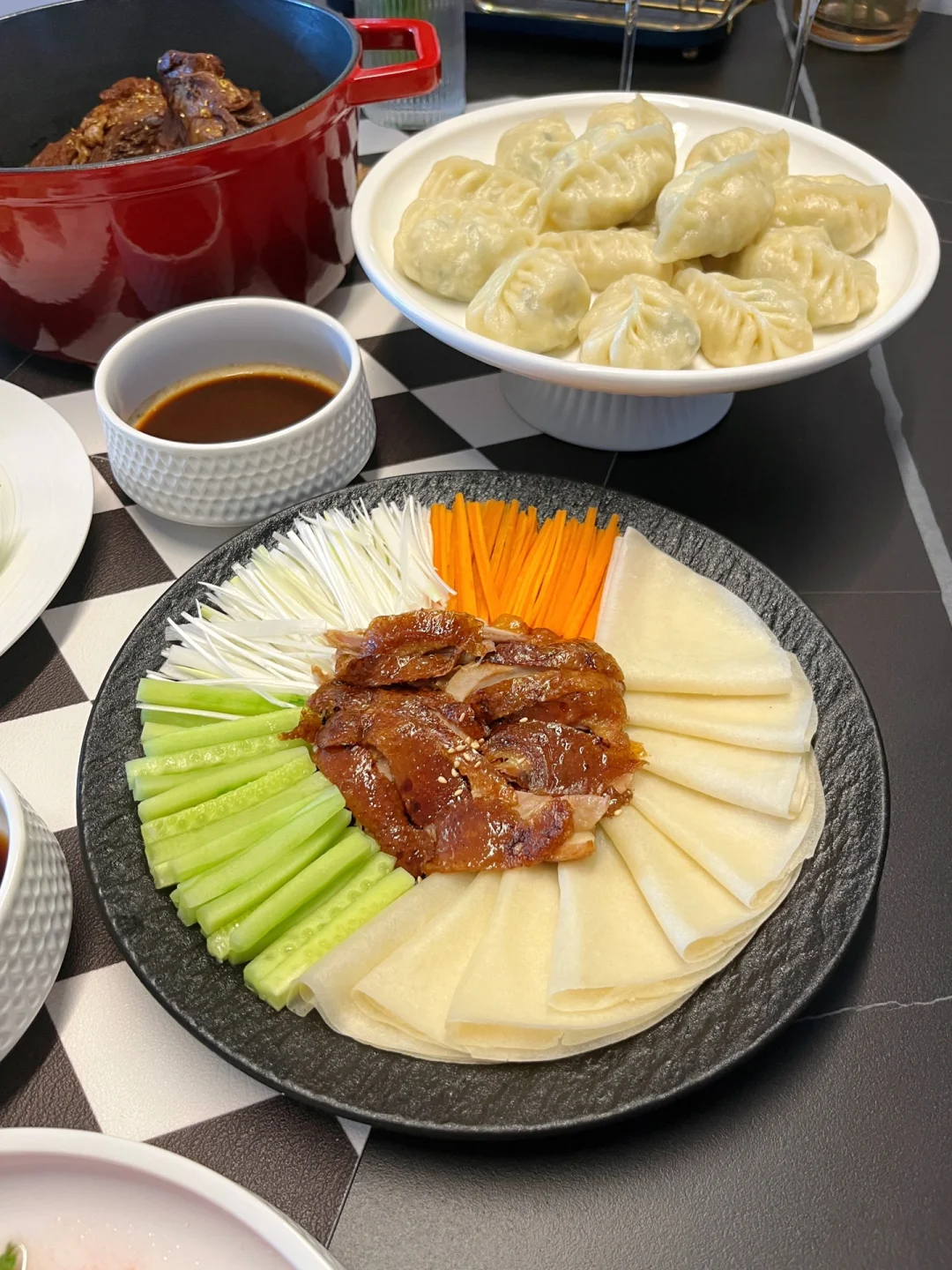 有家回,有人等,有饭吃,家人闲坐,三餐四季,才是生活啊! 【今日美食】 🥢酱大棒骨 🥢素馅蒸饺 🥢烤鸭春饼 🥢糖拌西红柿 🥢烤老豆腐 🥢水果:玉菇甜瓜 碎碎念:酱大骨三块,一人一块谁也别抢~蒸饺好久没做了,捏的也没有之前好看了,好在味道没变一样好吃[大笑R]还有烤鸭也是我一段时间没吃就想念的美食~