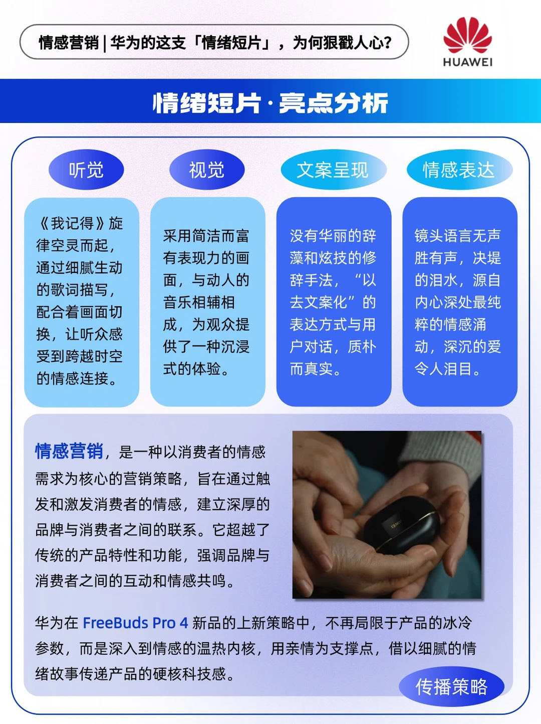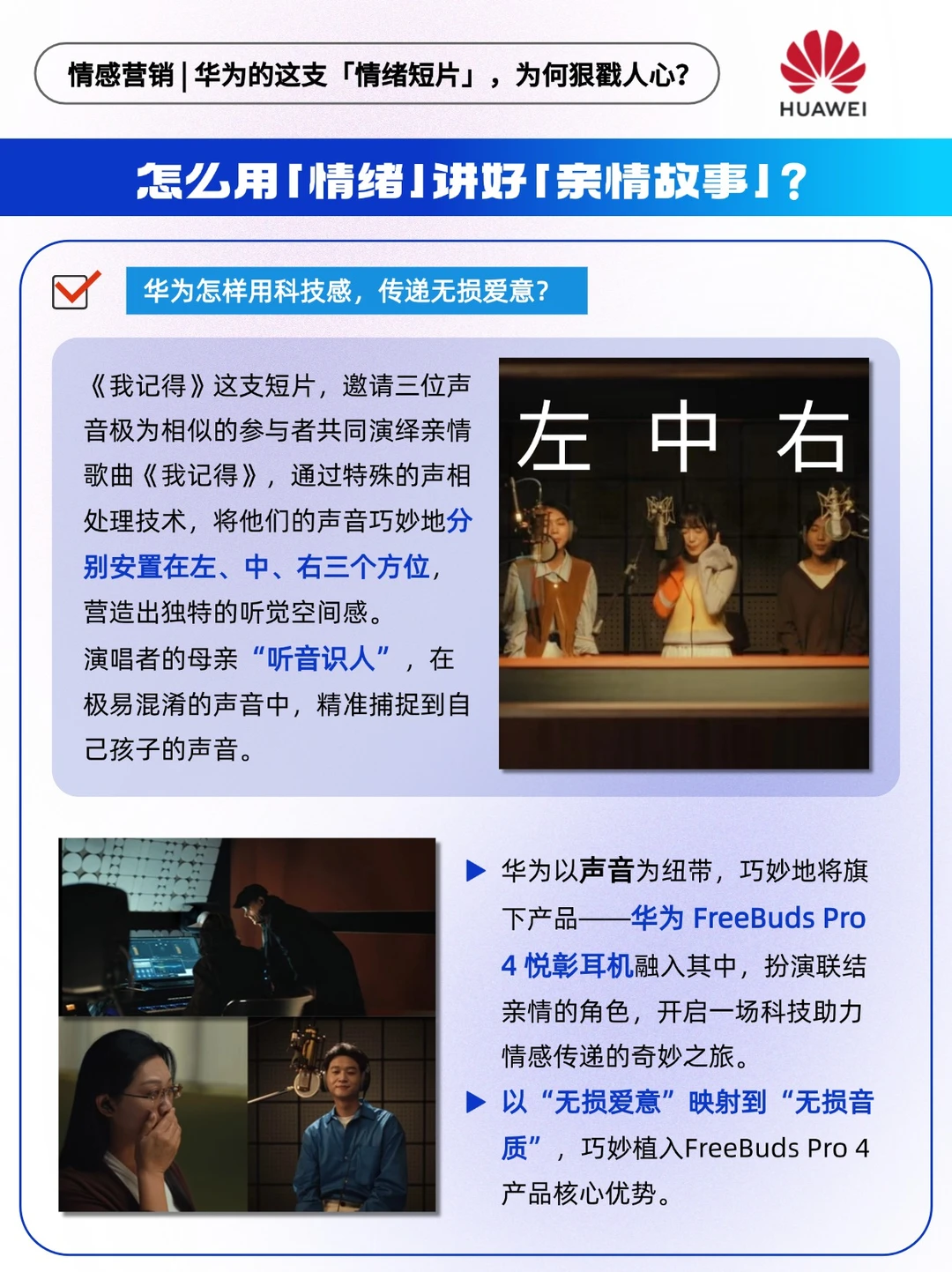🔵华为以声音为纽带,巧妙地将旗下产品——华为 FreeBuds Pro 4 悦彰耳机融入其中,扮演联结亲情的角色,开启一场科技助力情感传递的奇妙之旅,以“无损爱意”映射到“无损音质”,巧妙植入FreeBuds Pro 4 产品核心优势。