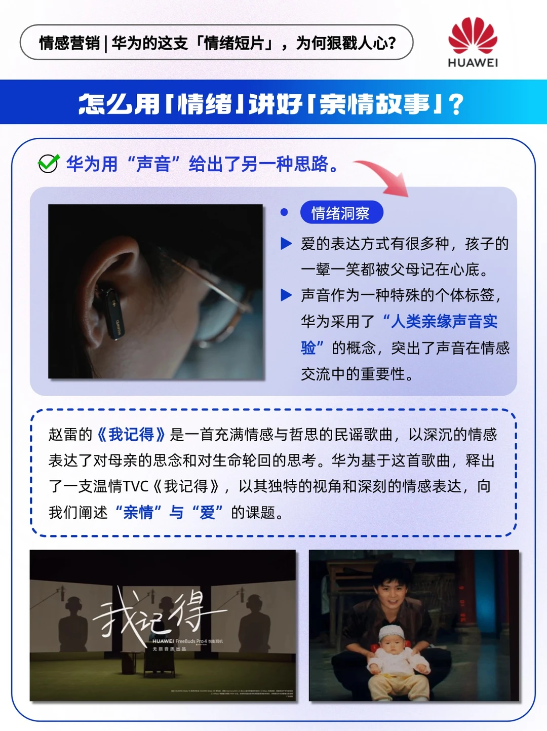 🔵华为基于这首歌曲,释出了一支温情TVC《我记得》,以其独特的视角和深刻的情感表达,向我们阐述“亲情”与“爱”的课题。