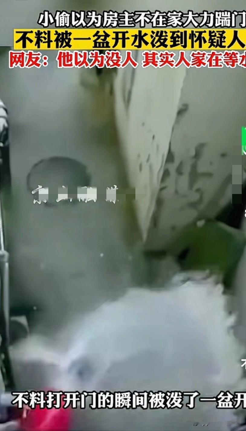小偷以为屋里没人,就使劲用脚踹门。不料,门突然打开了!一盆滚烫的开水,瞬间向他泼了过去! 热气里,小偷被烫的一边跑一边叫。有网友说:“这小偷如果被烫伤了,他会不会报警,追究屋主的责任?”还有网友,担忧地说:“屋主如果是,租的房子就好了,不行就搬走免得小偷以后报复他!” 大家的担心,都有道理!小偷被突然泼开水,他的身体肯定会被烫伤的!可能会皮肤红肿、起水泡,也可能会造成深层组织的损伤。 如果,得到专业的处理还好。但如果没有得到及时的处理,就可能引起感染或疤痕增生。这种事,大多属于紧急自卫的行为。如果没有明显的过失,是不会承担法律责任的。但具体,还看小偷被烫伤的部位和程度。