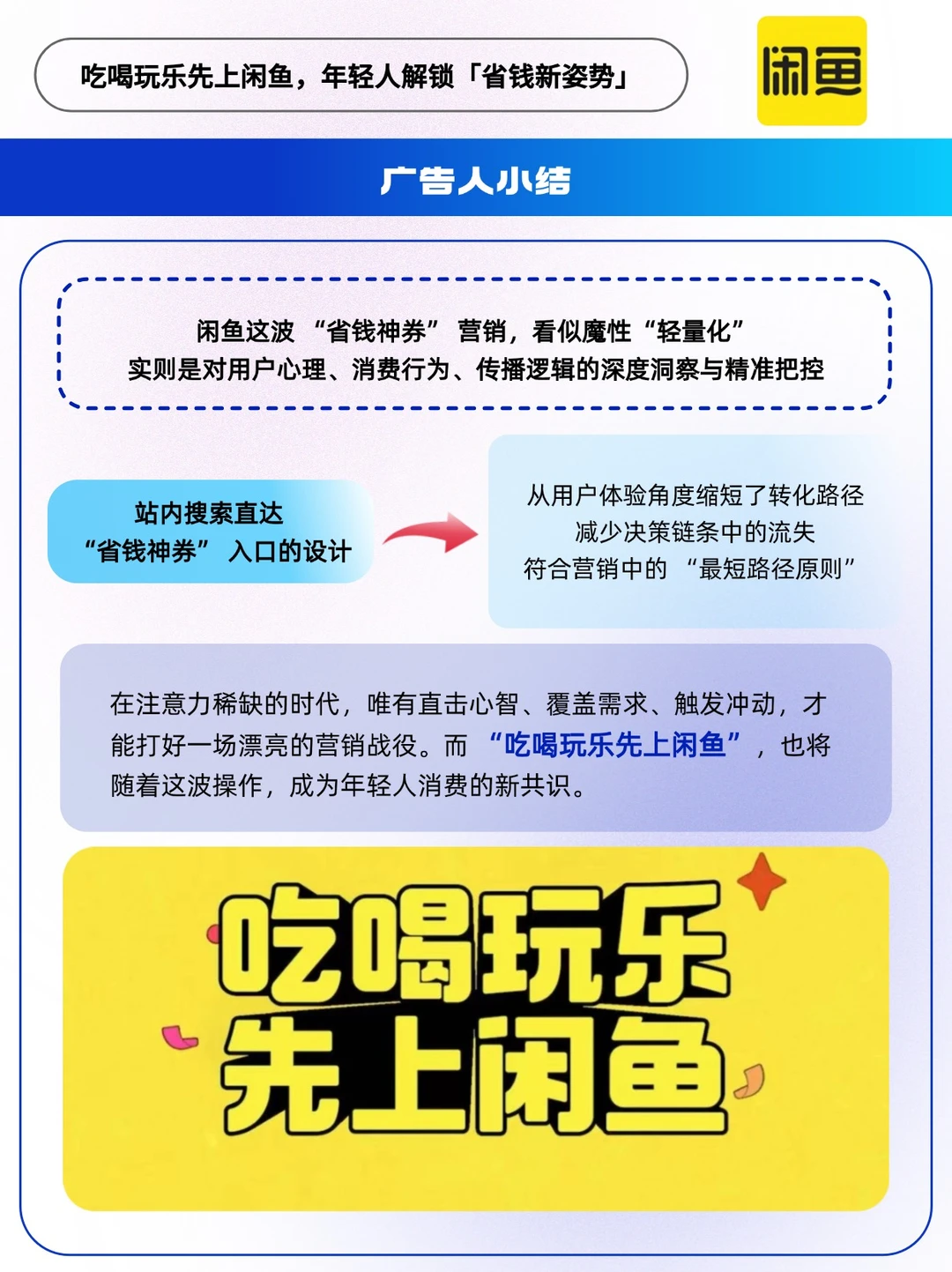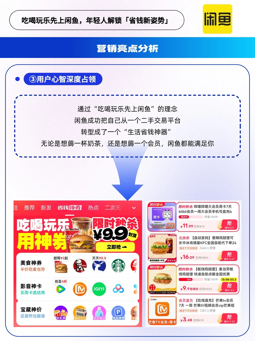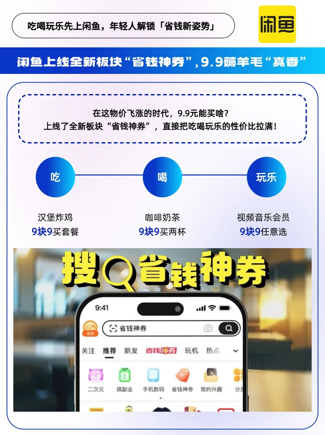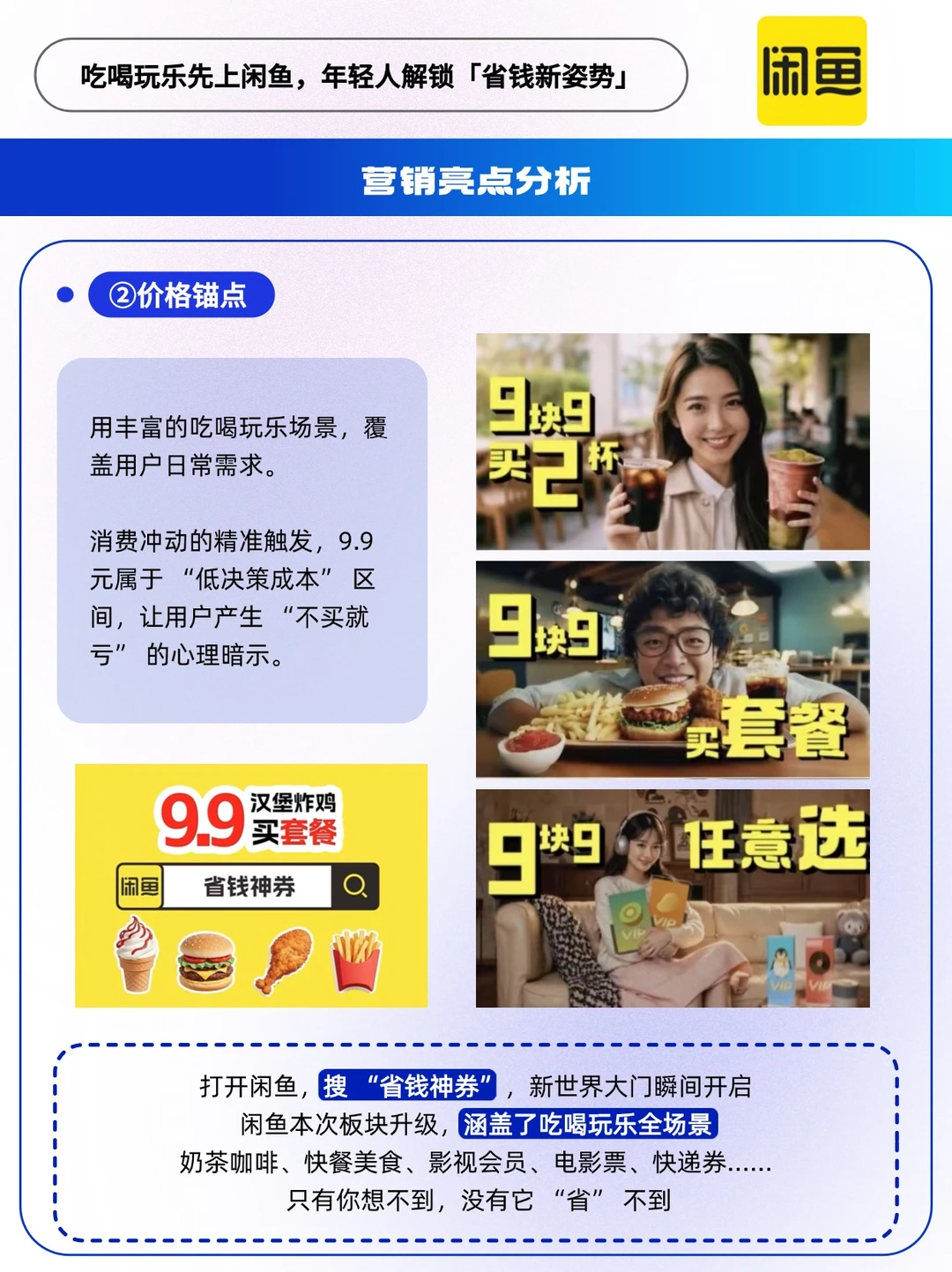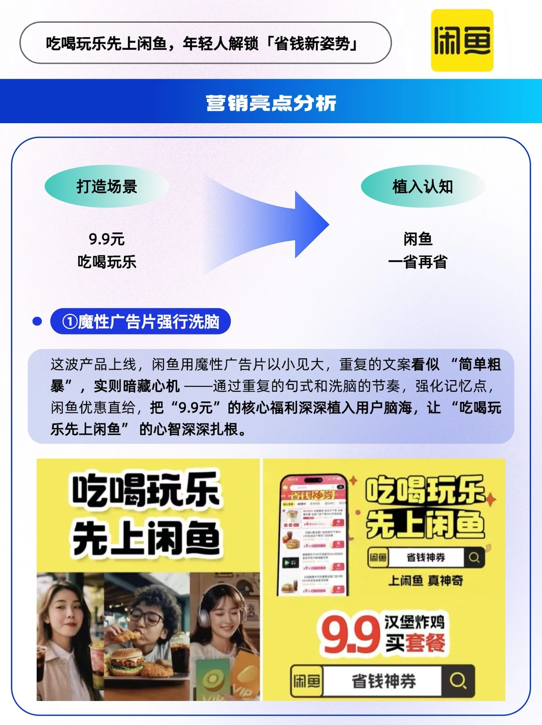 - 在这个万物皆可卷的时代, 闲鱼又双叒卷起来了, 它上线了全新板块“省钱神券”, 直接把吃喝玩乐的性价比拉满![喝奶茶R] 汉堡炸鸡、咖啡奶茶、影视会员、电影票……全都能用9.9元搞定! 这波操作不仅让人直呼“真香”,还让人忍不住想问:闲鱼到底还有什么是不能省钱的?![doge] 🔵这波产品上线,闲鱼用魔性广告片以小见大,重复的文案看似 “简单粗暴”,实则暗藏心机 ——通过重复的句式和洗脑的节奏,强化记忆点,闲鱼优惠直给,把“9.9元”的核心福利深深植入用户脑海,让 “吃喝玩乐先上闲鱼” 的心智深深扎根。 打造场景(9.9元吃喝玩乐) ⬇️⬇️⬇️ 植入认知(闲鱼一省再省) 花小钱,享大快乐 “吃喝玩乐先上闲鱼” 这波我先冲了~[得意R]
