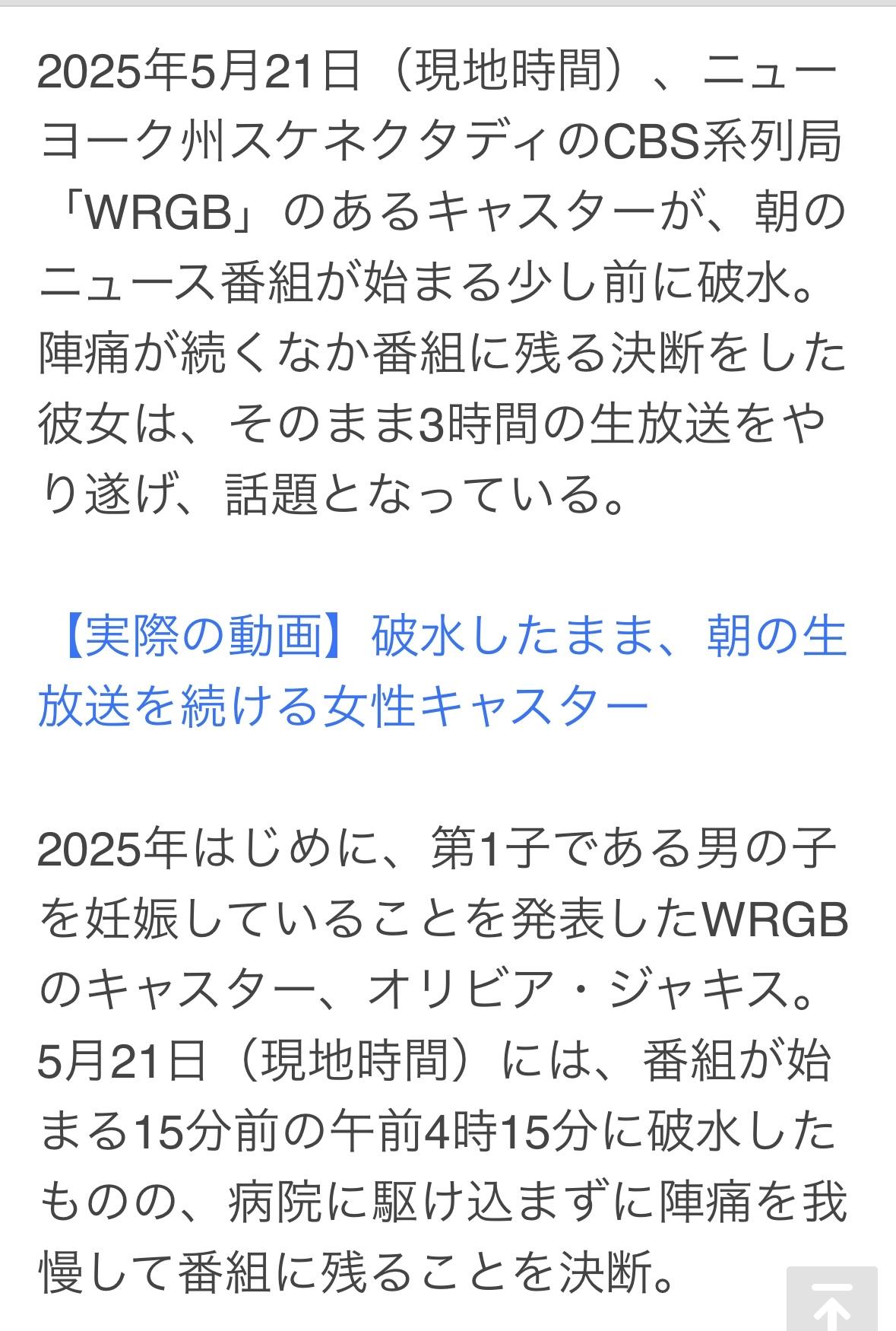 新闻主播在直播中羊水破了,但她仍然坚持播报了三个小时。这一史无前例的情况令观众震惊。 今年5月21日,纽约州斯克内克塔迪市CBS附属电视台WRGB的一位新闻主播在早间新闻节目开始前羊水破裂。尽管持续出现阵痛,她还是决定坚持完成节目,并完成了长达三小时的直播,成为当时的热门话题。