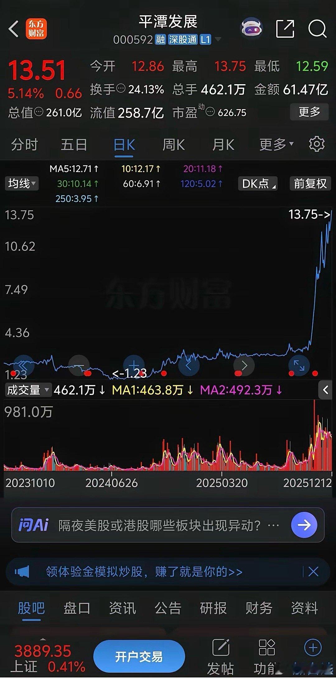 平潭发展又创新高了,航天动力又涨停了,雪人集团又涨停了,华菱线缆又涨停了,顺灏股份又涨停了,龙洲股份又涨停了,西部材料又涨停了,航天机电又涨停了。平潭发展周五开盘跳水后没过多久就被强悍的资金强势拉起暴涨7%,尽管冲高回落但是收盘仍然维持暴涨5.14%创新高,今年股价已经涨了4倍,从去年低点算已经涨了10倍,不知不觉已经挤入本轮牛市特大牛股行列。航天动力上涨动力仍然非常强劲,小阴线震荡大阳线上攻,雪人集团震荡中不断创新高,这些牛股股价都不太高,底部大多数是从几块钱开始起动,这波牛市低价股潜力不可小觑。
